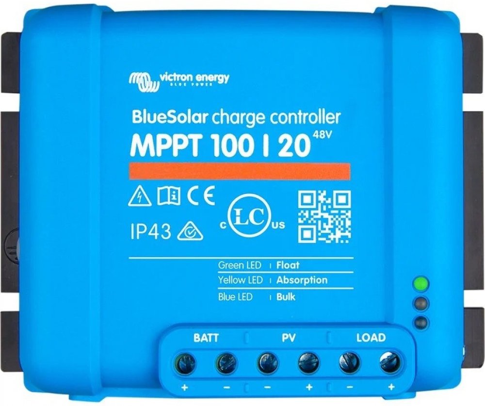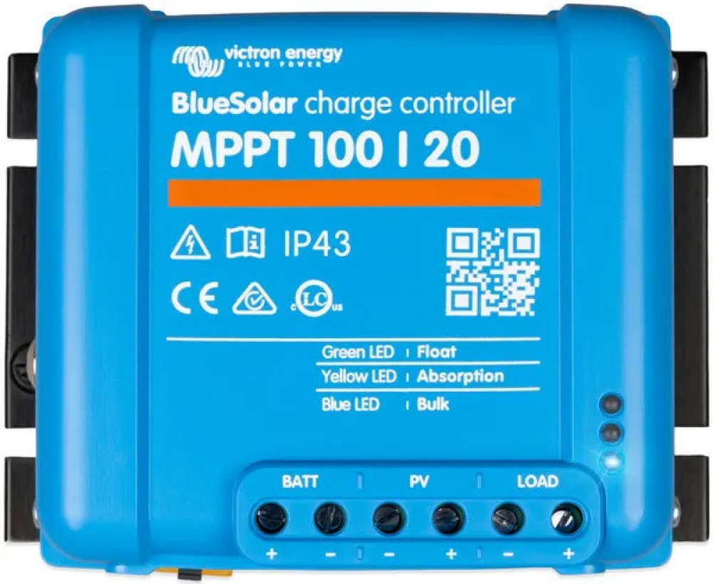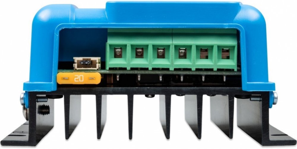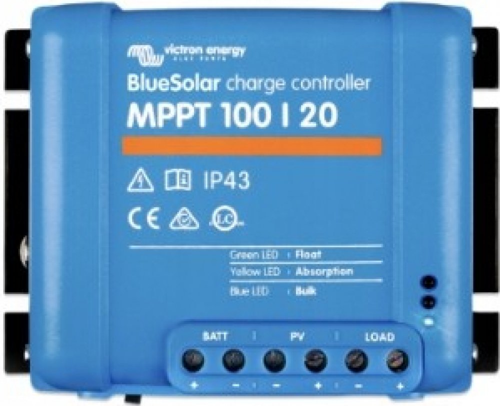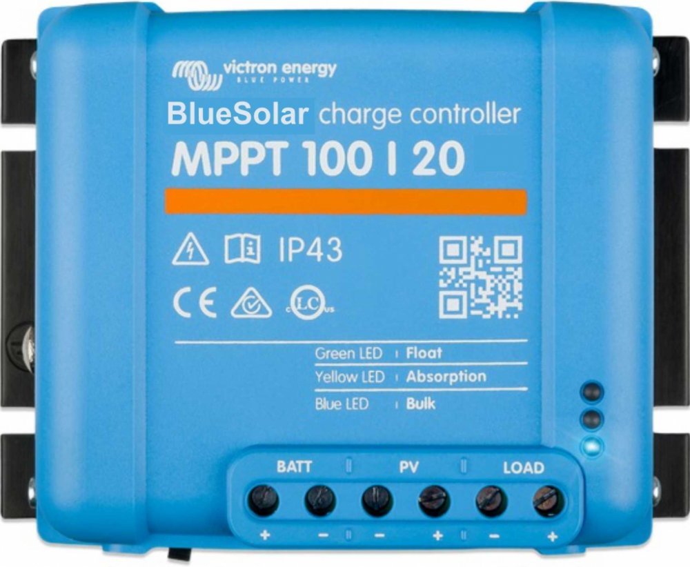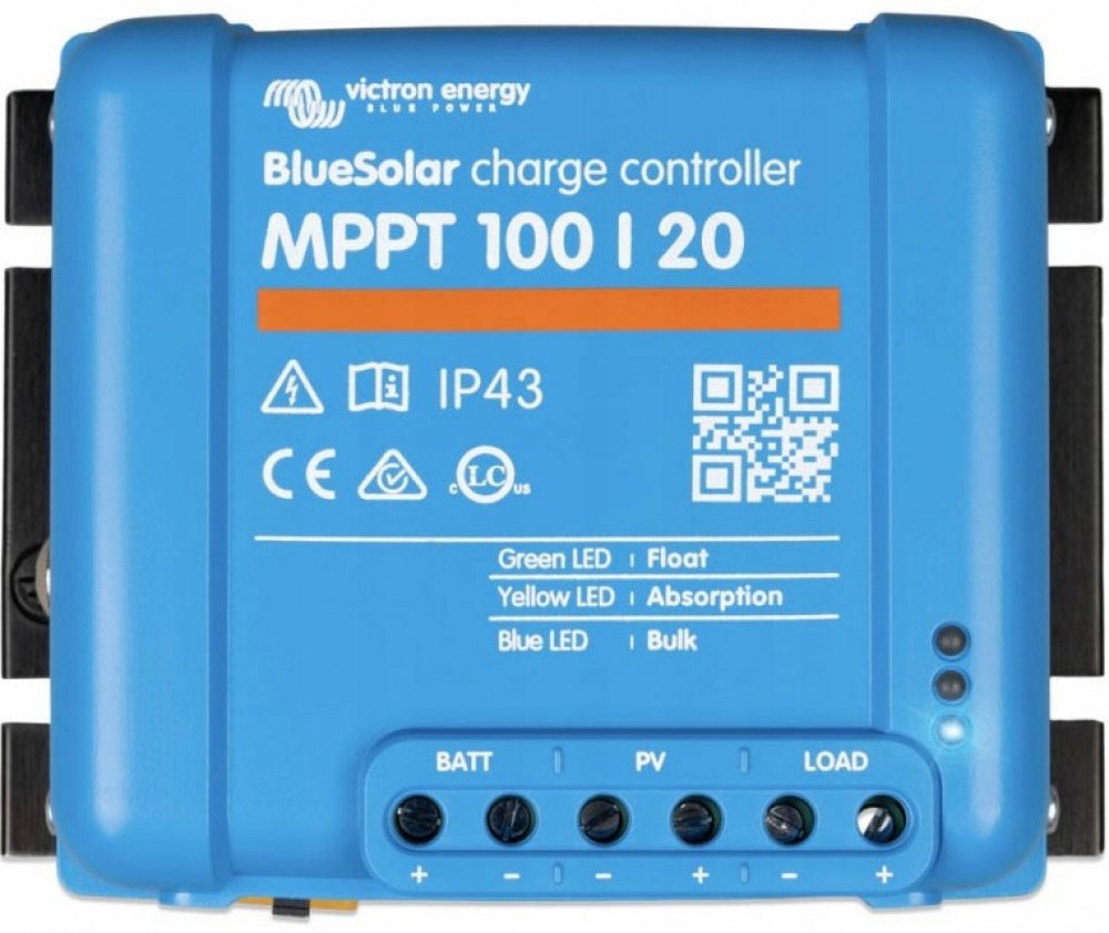 Robustní a rychlý MPPT regulátor pro náročné podmínky s napětím panelů až 100V, maximální nabíjecí proud 20 A. Baterie 12/24V/48, FV max 290/580/1160Wp.