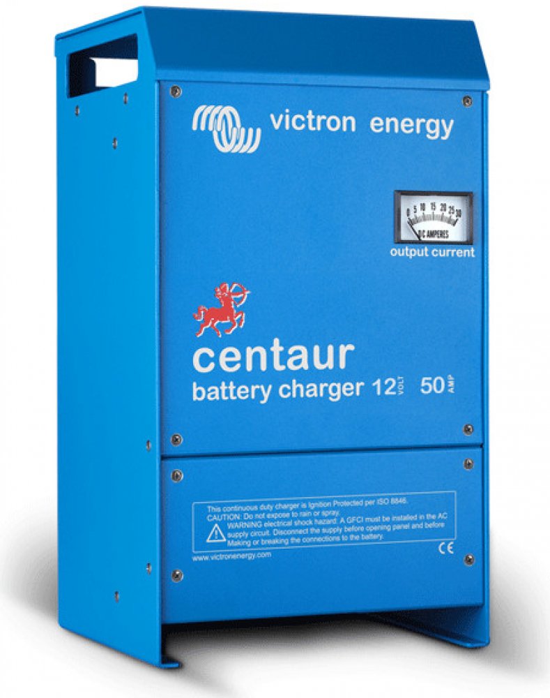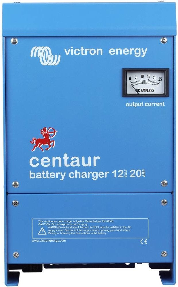 Nabíječka baterii Victron Energy Centaur 12V 50A s řízeným nabíjením až tří baterií.Nová řada nabíječek Centaur od společnosti Victron Energy byl navržen tak, aby byl skutečným celosvětovým produktem a splňoval požadavky CE pro Evropu a UL pro Spojené státy.Modelová řada modelů Centaur nabízí automatický vstup s rozlišením 90-265VAC 50/60 Hz, což znamená, že je možné jej použít kdekoliv na světě. Na rozdíl od jiných výrobků, které mají univerzální vstup, bude rozsah nabíječky Centaur udržovat plný výstupní výkon v rámci celého specifikovaného rozsahu.Model Centaur bude pracovat i na vstupu 90-400VDC, čímž se stane perfektním nabíjecím DC-DC konvertorem v systému Diesel Electric.Mezi další funkce patří úplná automatická třístupňová nabíjecí charakteristika, která zajišťuje, že baterie jsou plně nabité a tři izolované nabíjecí výstupy pro konfiguraci více baterií, aby vyhovovaly většině typických instalací. Vysoká odolnost vnějším vlivůmKryt je potažen hliníkoepoxidovou barvou pro vysokou odolnost vůči teplu, vlhku a slanému vzduchu. Vnitřní elektronické části jsou speciálně chráněny proti vlhkosti a nečistotám speciálním akrylátovým nátěrem pro zaručení dlouhé životnosti zařízení. Třístupňové nabíjení Rychlé nabíjeníAbsorpceUdržováníNabíječka nabíjí rychlým nabíjením, následuje čtyřhodinová fáze absorpce a nakonec automaticky nabíjení přejde do udržování baterie v nabitém stavu. Možnost trvalého napojení na baterie bez obav z přebíjení a zplyňování elektrolytu. Vnitřní teplotní senzor sleduje teplotu okolí a adekvátně snižuje nabíjecí napětí o 2 mV na každý ° C. Nabíjení olověných baterií v počtu až tří kusů.Určeno pro gelové baterie, AGM baterie a baterie s tekutým elektrolytem s manuální možností jejího předvolby pomocí DIP přepínače podle odpovídající předdefinované nabíjecí charakteristiky (viz tabulka níže). Nabíjecí charakteristika je továrně přednastavena pro gelové baterie. Maximální nabíjecí proud 50A. V případě nabíjení více baterií je každá baterie nabíjí maximálním nabíjecím proudem. V případě napájení více baterií je minusový pól společný, kladný pól náleží vždy jen jedné baterií. Baterie jsou diodovými odděleny, mohou tak být vybíjeny nezávisle na sobě. Baterie mohou mít rozdílné kapacity, je ale nutné, aby byly stejného konstrukčního typu.Široký rozsah vstupního napětí od 90V do 265V střídavého (AC) proudu a frekvence od 45 - 65 Hz bez nutnosti nastavování. Nabíječka však zvládá i vstupní napětí od 90 do 400V stejnosměrného (DC) proudu. To dělá tuto nabíječku univerzálně použitelnou po celém světě.Ručičkový ukazatel na čelní straně, ukazuje aktuální hodnoty nabíjecího proudu.Nabíječka Centaur není individuálně nastavitelná pomocí VE Configure programu.Zelená LED dioda signalizující chod nabíječky.Je určen pro vnitřní instalaci na suchém a dobře větraném místě. Doporučená je svislá montáž, ovšem přijatelná je i vodorovná montáž.Délka kabeláže mezi nabíječkou a bateriemi by neměla být delší než 6 metrů. Kabeláž by měla odolat teplotám přinejmenším 75°C. Doporučené příslušenstvíHlídač stavu baterií BMV 600Sbateriový alarm Technické parametryVstupní rozsah napětí střídavého proudu (AC): 90 - 265 VVstupní rozsah napětí stejnosměrného proudu (DC): 90 - 400 VFrekvence: 45 - 65 HzTovární nastavení absorpčního napětí (absorption): 14,3 VTovární nastavení udržovacího napětí (float): 13,5 VMaximální počet nabíjených baterií: až 3 ksMaximální nabíjecí proud: 50 ANabíjecí charakteristika: třístupňová (IUoU)Doporučený rozsah kapacity baterií: 200 - 500 AhTeplotní senzor pro kompenzaci nabíjecího napětí: interní, - 2 mV / ° C na každý článekTyp chlazení: nucený (teplotně a proudově řízený větrák)Ochrany: proti zkratu na výstupu k bateriím, vysoká teplota nabíječkyRozsah provozních teplot: - 40 až + 60°COchrana proti vzplanutí: anoMaximální (nekondenzující) vlhkost: 95%Materiál a barva krytu: hliník, modrá RAL 5012Napojení kabeláže od baterií: vnější závit M8Napojení kabeláže napájení: svorkovnice na dráty 4 mm2Stupeň krytí: IP 21Hmotnost: 5 kgRozměry (výška x šířka x hloubka v mm): 426 x 239 x 135 Ke stažení