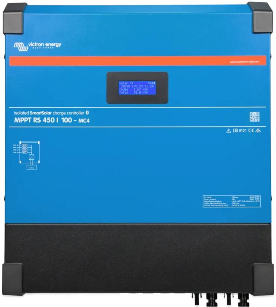 Vestavěný displejDisplej je umístěn na přední straně regulátoru a umožňuje zobrazit všechny provozní podmínky.Izolované připojení FV pro větší bezpečnostPlně galvanické oddělení mezi FV a bateriovým připojením poskytuje dodatečnou celkovou bezpečnost systému.Sledování izolačního odporu PV při vyšších napětíchŘídicí jednotka MPPT RS nepřetržitě monitoruje FV panely a dokáže detekovat případné poruchy, které snižují izolaci panelů na nebezpečnou úroveň.Připojení I/OProgramovatelné relé, teplotní čidlo, pomocný, digitální vstup a čidlo napětí. Vzdálený vstup může přijímat signály ze systému Victron BMS.Doporučená konfiguracePro 48V baterie. Maximální stejnosměrný nabíjecí výkon systému 5760 W. Při překročení těchto hodnot nedojde k poškození regulátoru, ale pouze k automatickému snížení příkonu z panelů na přijatelné hodnoty.Poznámka: Regulátor není možné kombinovat s optimalizátory, v případě takové kombinace hrozí nevratné poškození regulátoru.Maximální vstupní zkratový proud do regulátoru z fotovoltaických panelů nesmí překročit 20 A na vstup, jinak může dojít k trvalému poškození.Maximální vstupní napětí z FV panelů, označované jako Voc (prázdné napětí), nesmí překročit 450 V, jinak může dojít k trvalému poškození - je třeba vzít v úvahu, že Voc se zvyšuje s klesající teplotou. Rozsah provozního napětí MPPT je 80-450V, spouštěcí napětí je 120V.