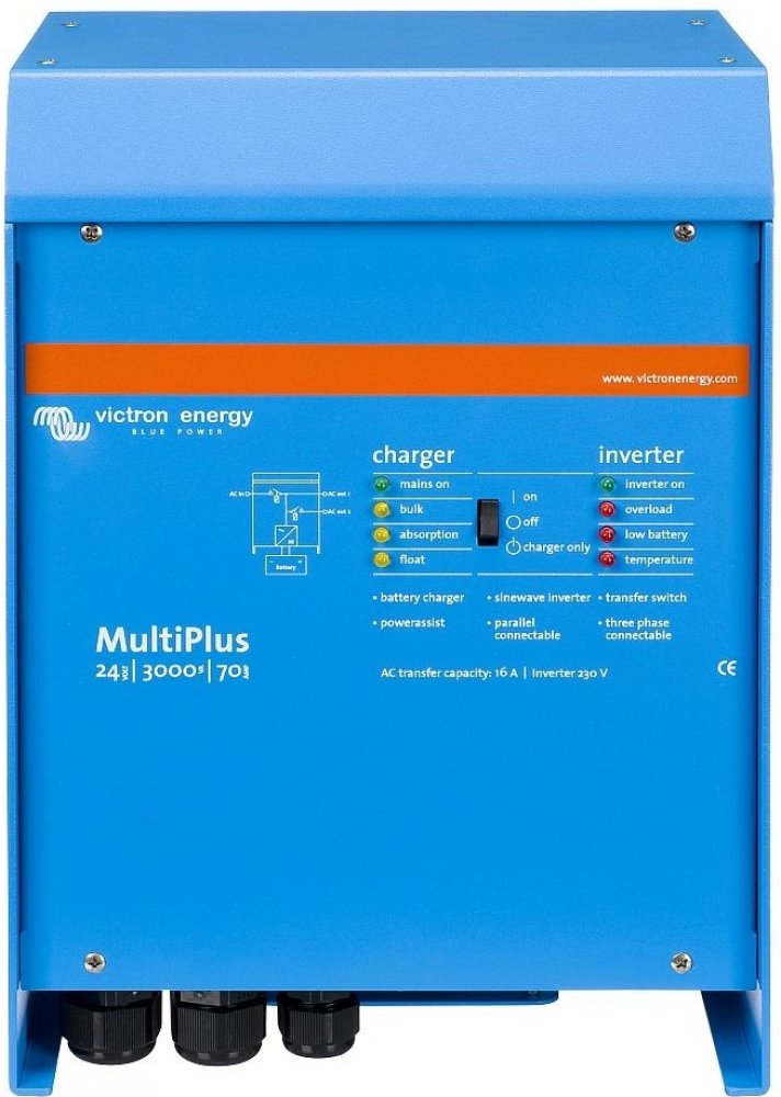 Měnič Victron Multiplus C 24V 3000VA 70A- 16A čistý sinus Multifunkční měnič MultiPlus C 24/1200 je výkonný DC-AC střídač / invertor / s čistě sinusovým výstupním napětím, se sofistikovanou adaptivní nabíječkou záložních baterií a ultra rychlým přepínačem smyčky napájení / bypassu / do 20ms. Střídač je umístěn v hliníkovém kompaktním krytu. Modelové řady se vyrábí o výkonu 800VA-5000VA. Záruka výr...