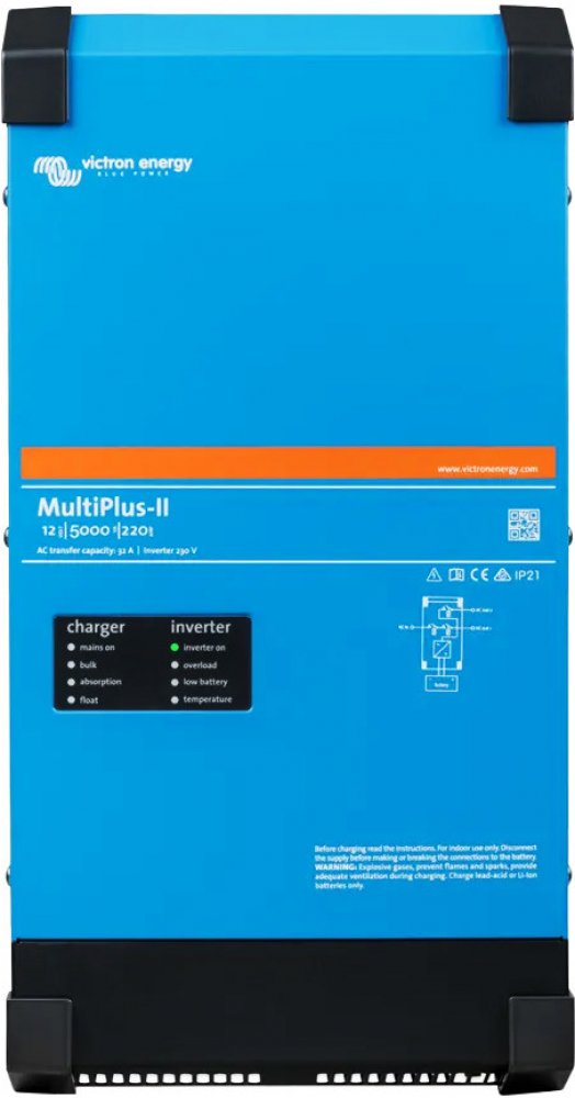 Hybridní fotovoltaický měnič MultiPlus-II 12/5000 je výkonný DC-AC střídač invertor s čistě sinusovým výstupním napětím, se sofistikovanou adaptivní nabíječkou záložních baterií a ultra rychlým přepínačem smyčky napájení bypassu do 20 ms. Střídač je umístěn v plechovém kompaktním krytu. Modelové řady se vyrábí o výkonu 800 VA - 5000 VA.