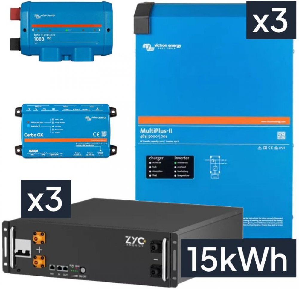 Až 6 jednotek MultiPlus může pracovat paralelně k dosažení vyššího výkonu. Šest x 24/5000/120 měničů, například poskytuje 25 kW / 30 kVA výkon a 720 A nabíjecí kapacitu.