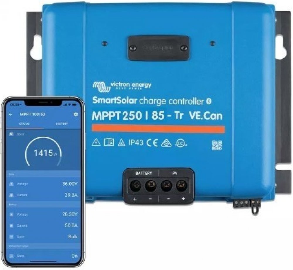 Robustní a rychlý MPPT regulátor s VE.Can pro náročné podmínky s napětím panelů až 250 V, nabíjecí proud 85 A. Baterie 12/24/48 V, FV max. 1200/2400/4900 Wp. Vestavěné Bluetooth a konektor pro zásuvný displej.