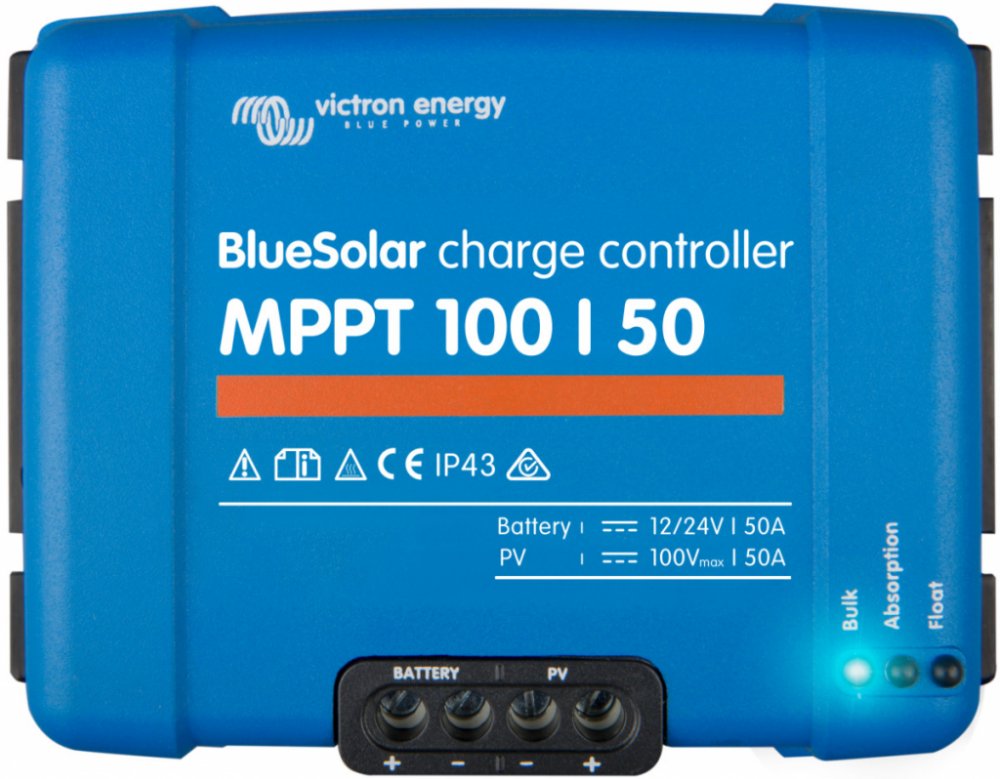 Robustní a rychlý MPPT regulátor pro náročné podmínky s napětím panelů až 100 V, maximální nabíjecí proud 50 A. Baterie 12/24 V, FV max. 700/1400 Wp. Vestavěné Bluetooth a VE.direct rozhraní.