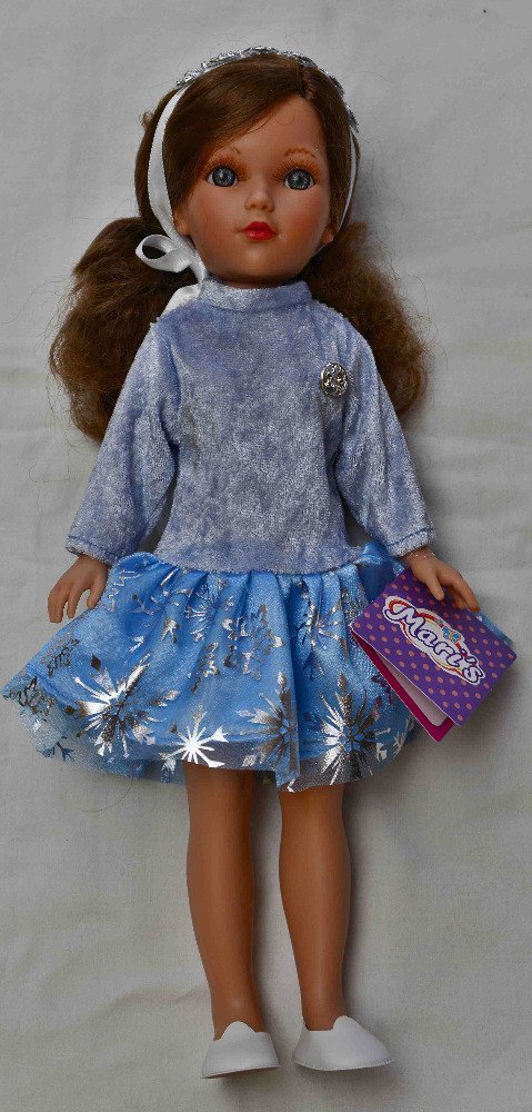 Realistická panenka Monika z kategorie Little Mari´s je od firmy Vidal Rojas ze Španělska, je vysoká 35 cm, má dlouhé hnědé vlasy. Panenka Monika má modré nemrkací oči. Celé tělíčko má vyrobené z kvalitního vinylu. Je oblečena pouze do bílých kalhotek, červených podkolenek a bílých nízkých bot.