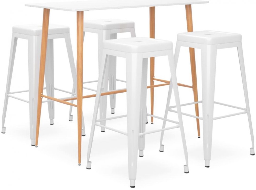 Náš vysoký stůl má horní desku z odolné MDF a pevné kovové nohy, které vzhledem připomínají dřevo. Barové stoličky jsou vyrobené z natíraného kovu, což jim zajišťuje mimořádnou robustnost a dlouhou životnost. Zesílená příčka pod sedákem a opěrka nohou zlepšují stabilitu. Židle lze navíc stohovat, aby se vám snáze skladovaly, jedná se tedy o dokonalé řešení pro omezené prostory.