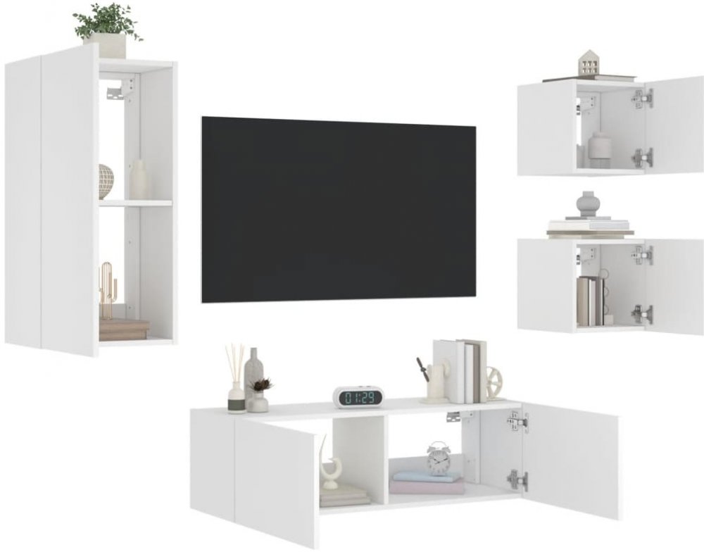 Tyto nástěnné televizní skříňky s LED osvětlením představují skvělý způsob, jak maximalizovat úložný prostor v domácnosti a zabránit hromadění nepořádku na podlaze. Odolný materiál: Kompozitní dřevo je mimořádně kvalitní, má hladký povrch a vyznačuje se pevností, stabilitou a odolností proti vlhkosti. Tyto plovoucí TV skříňky jsou zhotoveny z kompozitního dřeva, takže jsou pevné a odolné.Dostatek úložného prostoru: Závěsná obývací stěna nabízí spoustu úložného prostoru, kde si můžete uložit vaše DVD přehrávače, knihy, časopisy a různé dekorace.RGB LED světla: Nástěnné mediální skříňky jsou vybaveny živými RGB LED světly. Různé přizpůsobitelné nabídky vám umožní snadno změnit barvu světel nebo dokonce i nastavit světla tak, aby se přizpůsobila automaticky.Nástěnný design: Tyto TV skříňky s úložným prostorem lze připevnit na zeď, abyste měli ještě více úložného prostoru. Tímto způsobem můžete maximalizovat podlahovou plochu a udržet si v místnosti pořádek. Je dobré vědět:Šrouby a hmoždinky pro vnitřní stěnu nejsou součástí dodávky. Doporučujeme najít a použít šrouby a hmoždinky vhodné speciálně pro stěny u vás doma. Pokud si nejste jisti, můžete se poradit s odborníkem. Přečtěte si všechny kroky pokynů a postupujte podle nich.Produkt je vybaven USB konektorem, který vyžaduje certifikovaný zdroj napájení 5V USB (není součástí dodávky). Nepoužívejte tento výrobek, pokud jsou některé jeho součásti poškozené, roztržené nebo pokud zcela chybí. Tento výrobek je napájen stejnosměrným napětím 5 V, certifikovaný zdroj napájení 5 V USB ale není součástí dodávky. Vyšší napětí může způsobit přehřátí a může mít za následek poškození zařízení a vést k potenciálnímu riziku přehřátí a požáru.