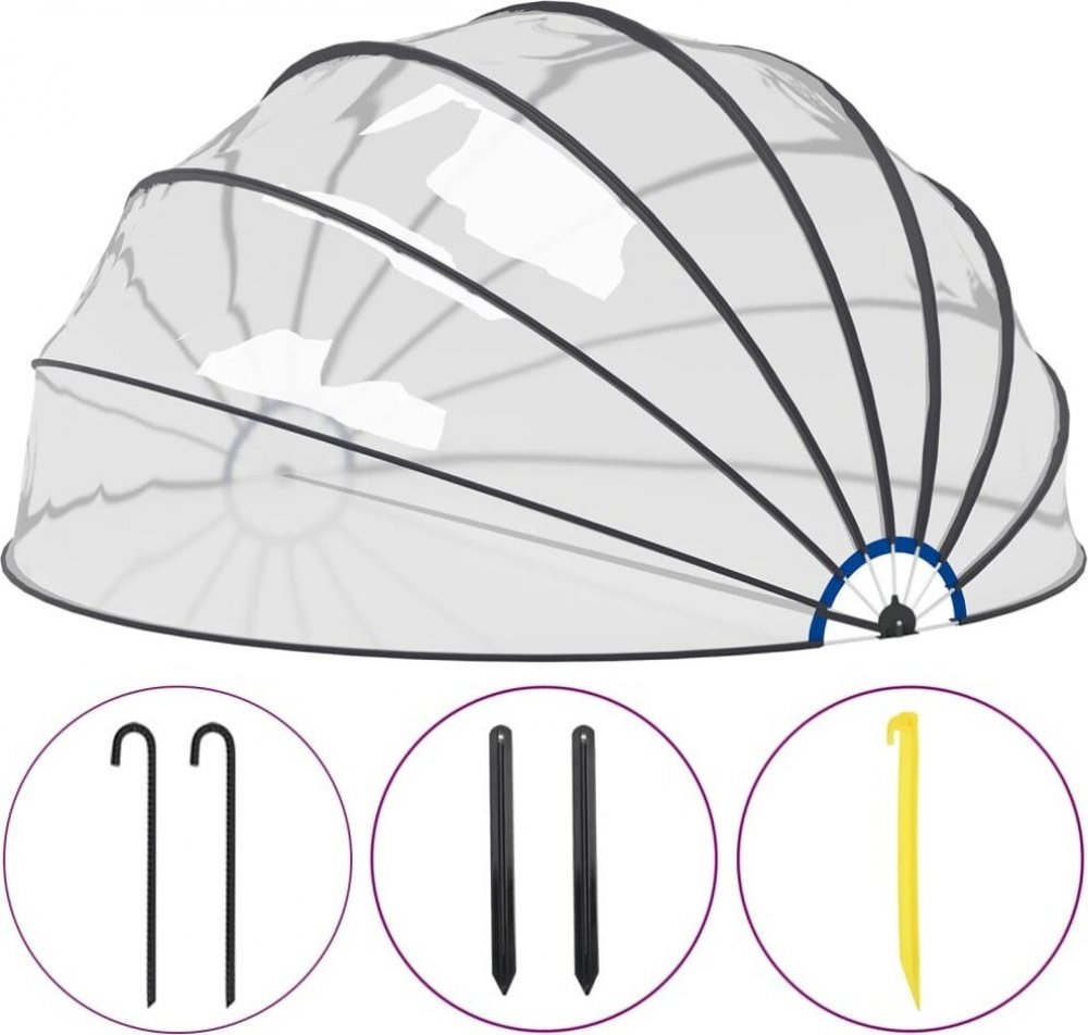 Užijte si ochranu, kterou tato bazénová kopule nabízí při plavání a cákání!Tento bazénový kryt z PVC s ochranou UPF 30 a konstrukcí ze skelných vláken nabízí vynikající ochranu před sluncem a deštěm. Zabraňuje vniknutí vnějších nečistot, jako je listí, hmyz a špína, do bazénu. V případě potřeby zajišťuje rychlejší ohřev bazénové vody a menší tepelné ztráty během noci. Zastřešení bazénu se snadno otevírá a zavírá díky jedinečnému skládacímu mechanismu. S touto průhlednou bazénovou kopulí vám neunikne nic, co se děje uvnitř i vně bazénu. K pevnému upevnění bazénové kopule k zemi potřebujete dodané zemní hroty a kolíky. Díky tomu se nemusíte obávat, že by bazénový pavilon odfoukl vítr.Tento bazénový stan je vhodný pro nadzemní bazény o maximálním průměru 500 cm a pro nadzemní bazény o maximálních rozměrech 460 x 120 cm (průměr x výška).Materiál: PVC, sklolaminátRozměry: 559 x 275 cm (průměr x výška)Průměr tyče: 14 mmTloušťka: přibližně 0,2 mmVhodné pro nadzemní bazény o maximálním průměru 500 cmVhodné pro nadzemní bazény o maximálních rozměrech 460 x 120 cm (průměr x výška)Barva: průhlednáInstalační příslušenství je součástí dodávky: AnoSnadné otevírání a zavírání