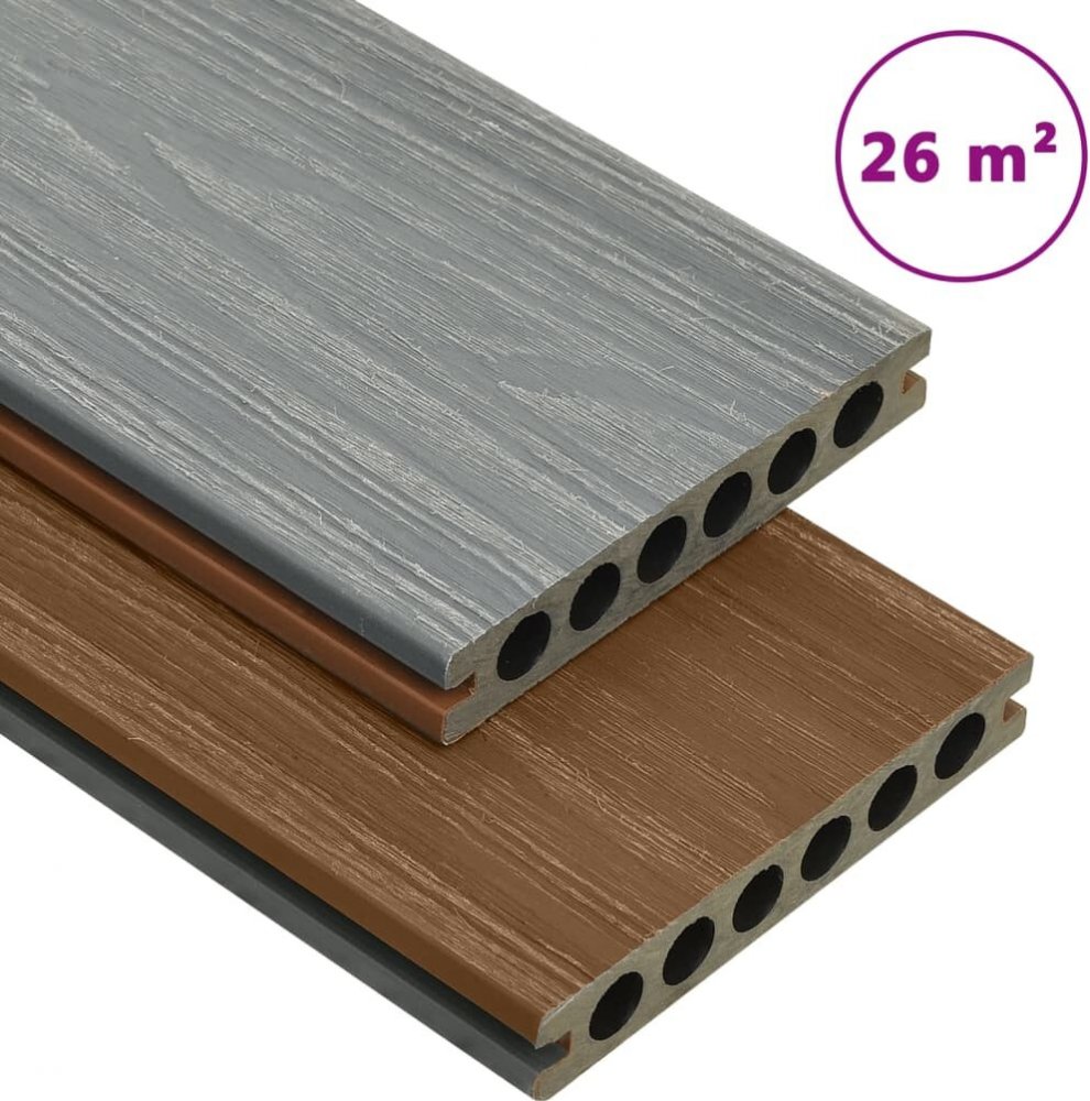 Tato kompletní sada terasových prken s příslušenstvím pokryje plochu o velikosti 26 m². Perfektně se hodí na terasy, balkóny a plochy v okolí bazénů či vířivek. Terasová prkna jsou vyrobená z dřevoplastového kompozitu, skvěle vzdorují vodě a jsou vysoce odolná, takže vydrží i dlouhodobé používání. Vzhledem ke své mimořádné tloušťce 23 mm jsou nesmírně bytelná. Na rozdíl od běžných podlahových dese...