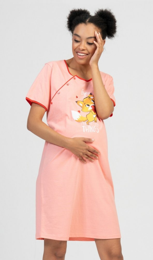 Dámská noční košile mateřská Liška. Mateřská noční košile je svým střihem určená na dobu těhotenství, do porodnice i ke kojení. Ke kojení slouží průstřihy po stranách košile uzavíratelné na knoflíky. Na hrudi je obrázek roztomilé rozesmáté lištičky, která sbírá srdíčka rozesetá kolem. Obrázek doplňuje nápis Enjoy the little things. Použitý materiál je jemný a poddajný na dotek. Košile je vhodná na...