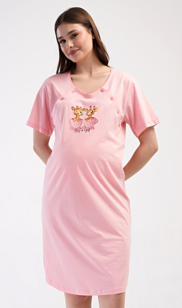 Dámská mateřská noční košile Žirafy.Dámská bavlněná mateřská noční košile Žirafy. Noční košile je svým střihem určená na dobu těhotenství, do porodnice i ke kojení. Ke kojení slouží průstřihy po stranách košile, které jsou uzavíratelné na knoflíky. Přední díl košile zdobí obrázek veselých žiraf. Použitý materiál s podílem bavlny 100% je příjemný a poddajný na dotek.Pokyny pro údržbu:- 100% bavlna-...