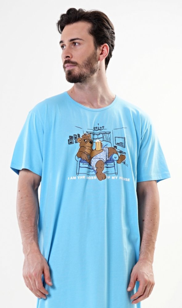 Pánská bavlněná noční košile s krátkým rukávem Boss. Pánská noční košile pro všechny milovníky pohodlí má na hrudi obrázek impozantního medvěda sedícího v křesle s pivem v tlapě a nápisem 'Im the Boss of my house'. Použitý bavlněný materiál je příjemný a poddajný na dotek.