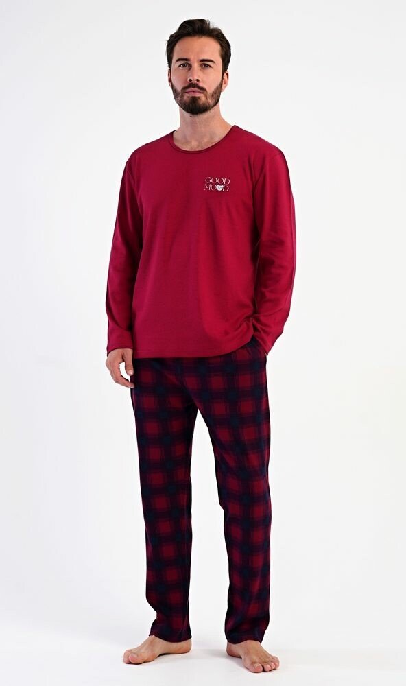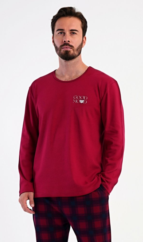 Pánské dlouhé bavlněné pyžamo Good mood. Pánské pyžamo se skládá z trika s dlouhým rukávem a dlouhých kalhot. Triko s kulatým výstřihem zdobí na hrudi malý obrázek a nápis GOOD MOOD. Kárované kalhoty mají v pase gumu, šňůrku na stažení a praktické kapsy. Použitý materiál INTERLOK s obsahem bavlny 100% je poddajný a příjemný na dotek.