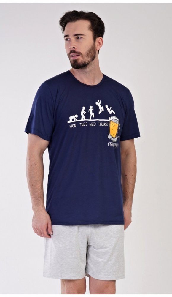 Pánské pyžamo šortky Filip. Pánské pyžamo se skládá z trička s krátkým rukávem a krátkých šortkových kalhot. Jednobarevné tričko s kulatým výstřihem je zdobeno veselým obrázkem panáčků, kteří se s blížícím víkendem nemůžou dočkat sklenice piva. Tričko doplňují jednobarevné šortky, které mají v pase gumu a šňůrku ke stažení. Nemají kapsy. Použitý materiál je příjemný a poddajný na dotek. Podíl bavl...