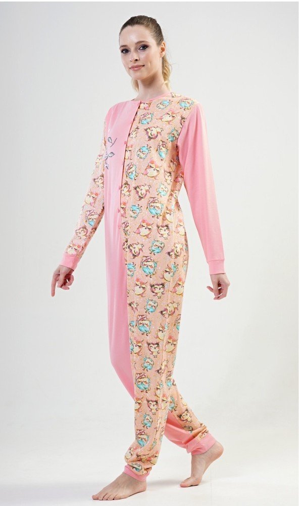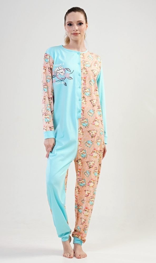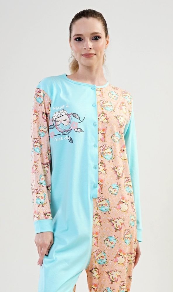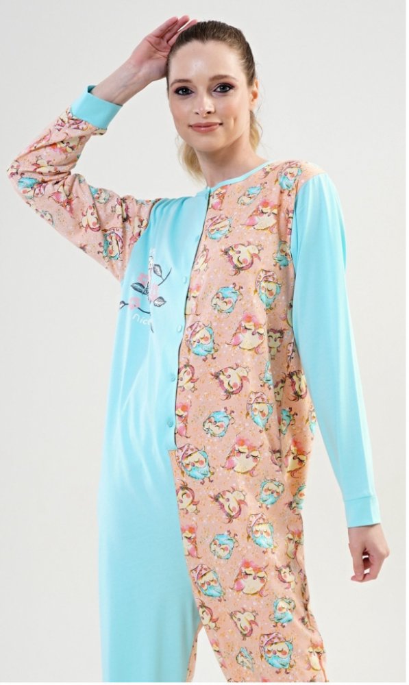 Dámský bavlněný overal Sovičky. Overal je celopropínací - z jedné strany zdobený obrázkem sovy s čepičkou, z druhé strany celoplošným potiskem soviček. Dlouhé nohavice jsou ukončeny elastickými lemy. Bavlněný materiál je poddajný a příjemný na dotek.