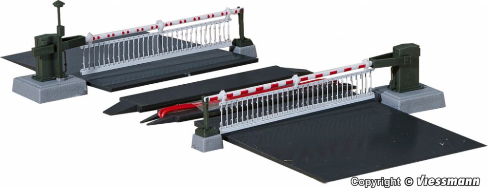 Automatické závory s příslušenstvím 63mm dlouhé. Dvě pohonné jednotky. Pomalý realistický chod závor. Pohonné jednotky jsou umístěny pod závorami. Sestavu doplňují dopravní značky. Závory jsou vybaveny digitálním dekodérem. Součástí dodávky je i kolejový přejezd, nájezdové rampy. Závory lze ovládat kontakty, digitálně, tlačítky nebo spínacími kolejemi. Lze ovládat analogově i digitálně. V ceně nej...