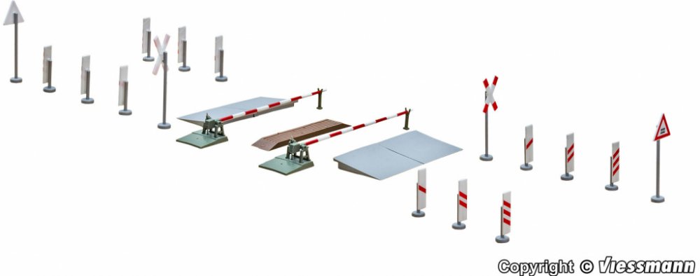 Mechanické závory. Dvě pohonné jednotky 16V. Pomalý realistický chod závor. Pohonné jednotky jsou umístěny pod závorami. Sestavu doplňují dopravní značky.