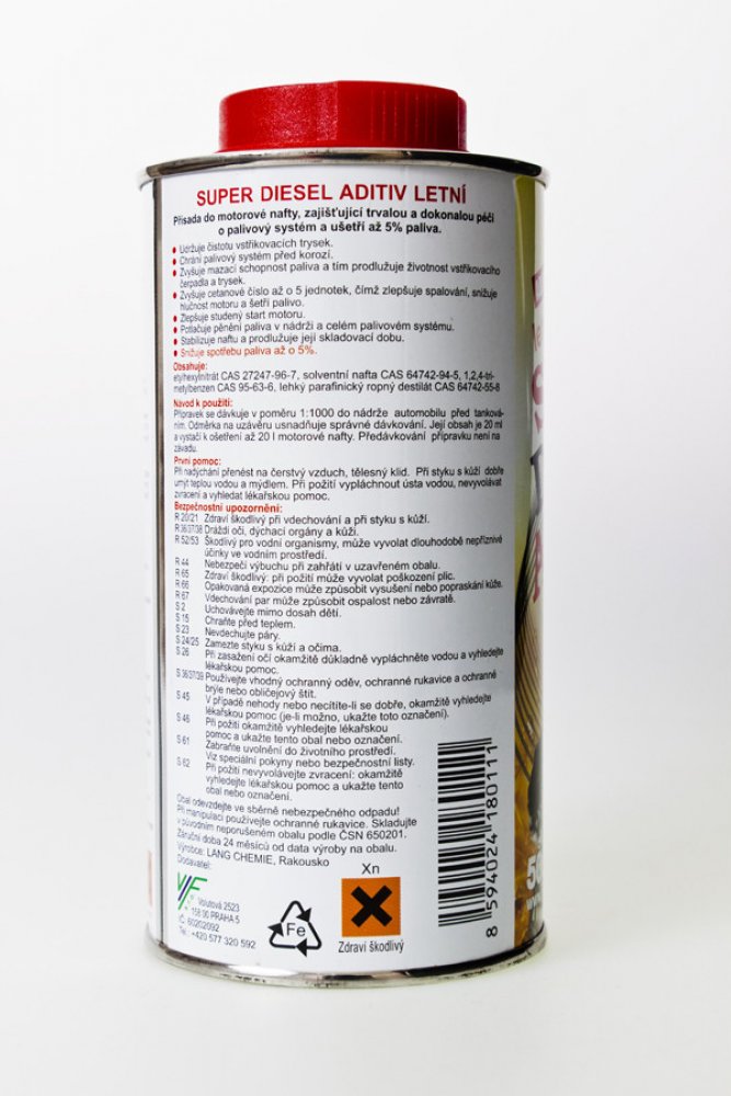 Letní přísada do motorové nafty, udržuje čistotu vstřikovacích trysek, chrání palivový systém před korozí, součásti motoru před zanášením karbonovými nečistotami, palivové čerpadlo před poškozením a snižuje spotřebu paliva až o 5 %. Zlepšuje studený start motoru. Potlačuje pěnění paliva v nádrži a celém palivovém systému. Stabili...