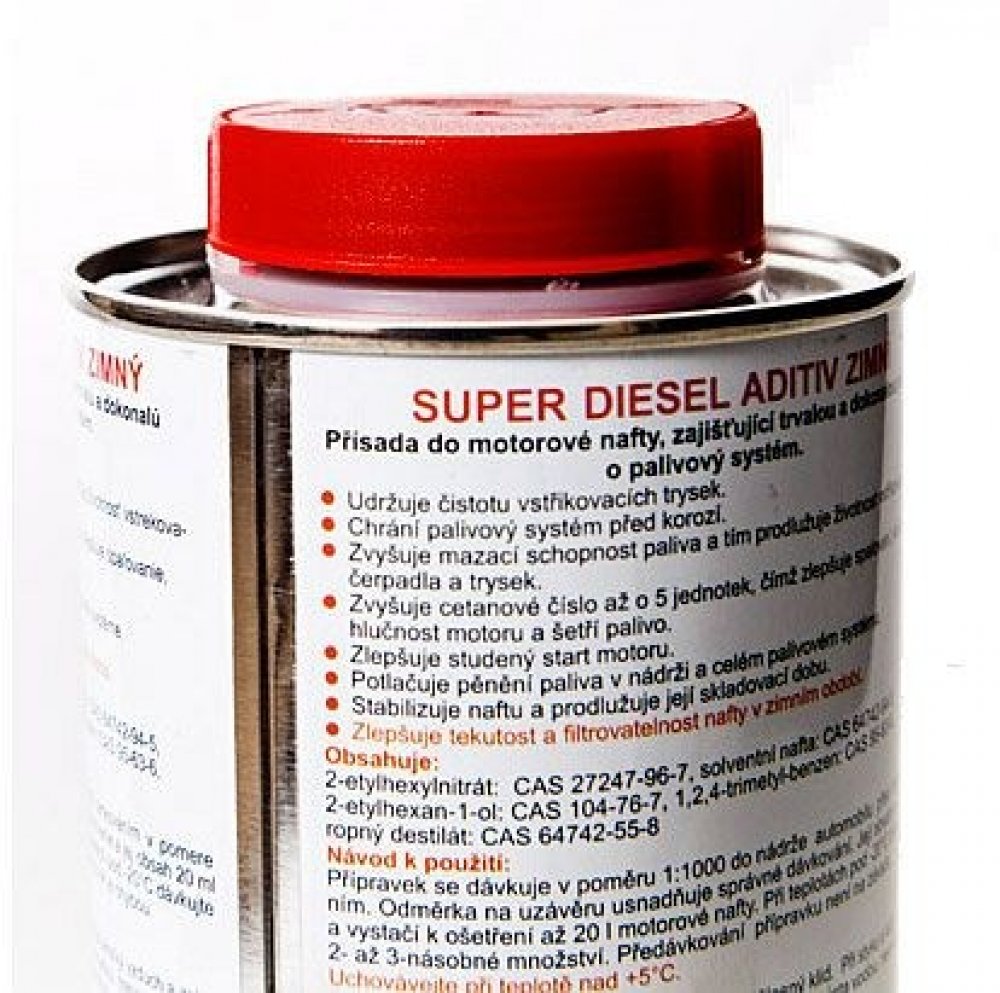 Zimní aditivum do nafty SUPER DIESEL ADITIV je multifunkční přísadou s protikorozním účinkem. Prodlužuje životnost palivového systému díky ochraně palivového čerpadla a údržbě čistoty vstřikovacích trysek. Udržuje nízkou spotřebu paliva a zlepšuje provozní pohotovost vozidla v zimním období zvýšením cetanového čísla nafty.