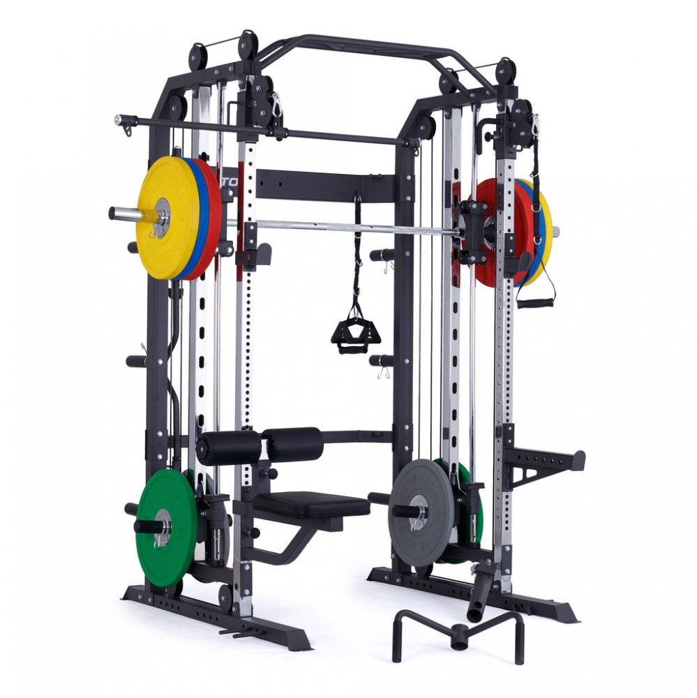 multipress a kladkový stroj, stojan na činku, hrazda, výškově nastavitelné kladky