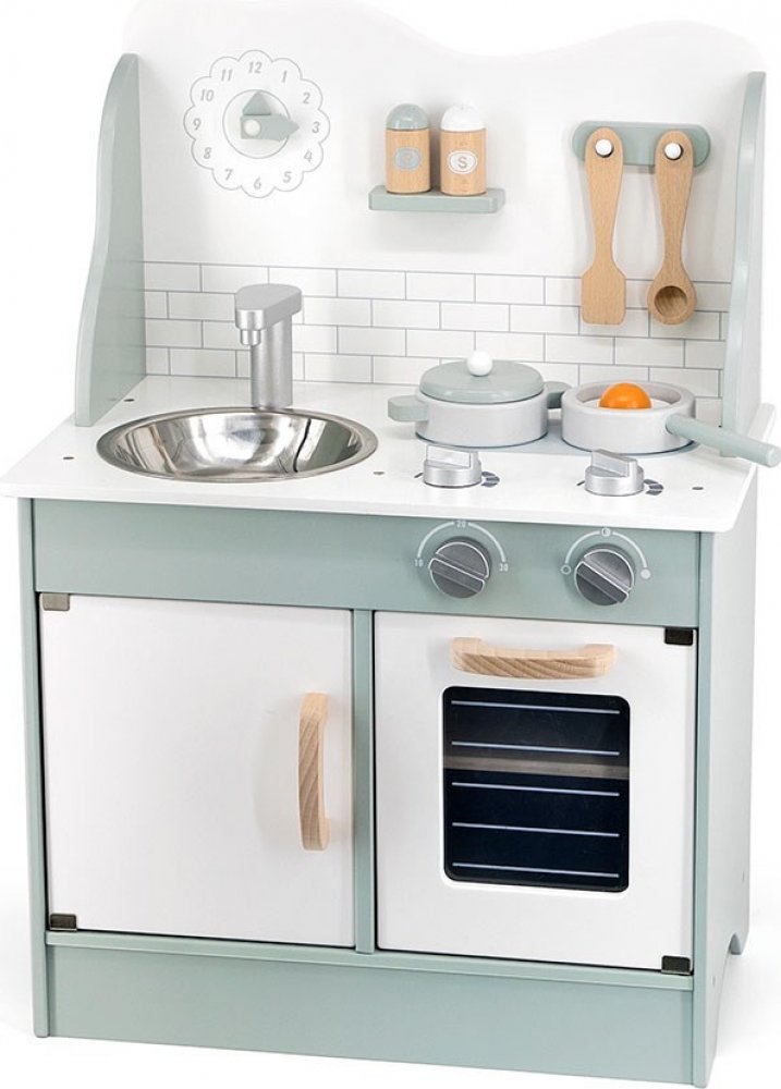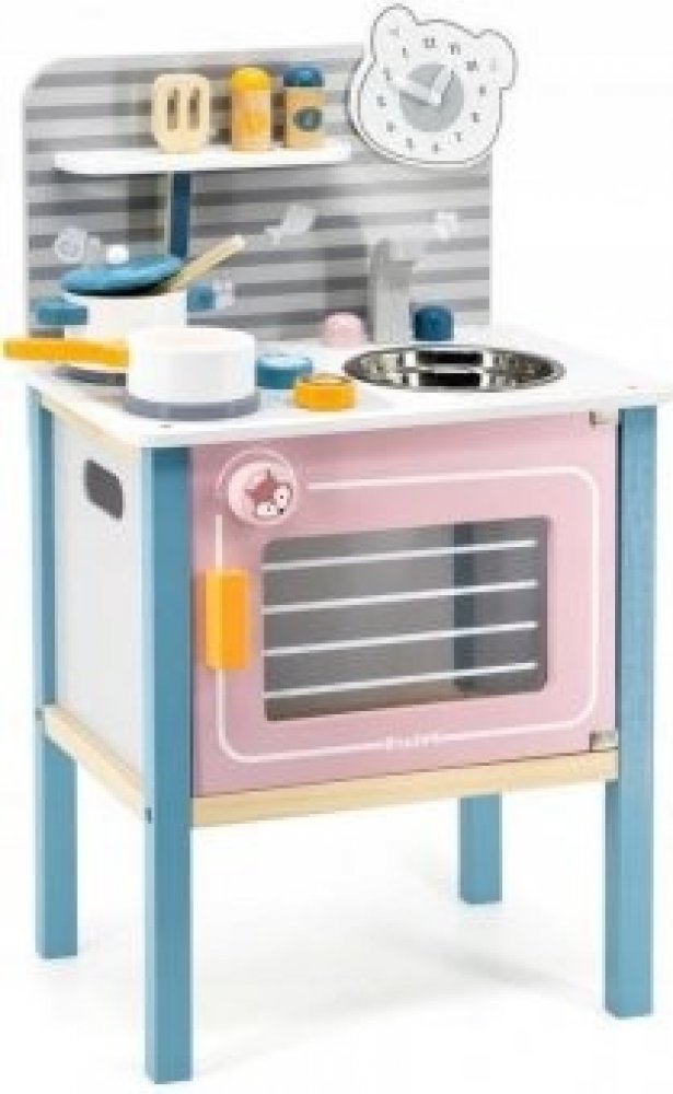 Dřevěná kuchyňka s troubou v pastelových barvách.