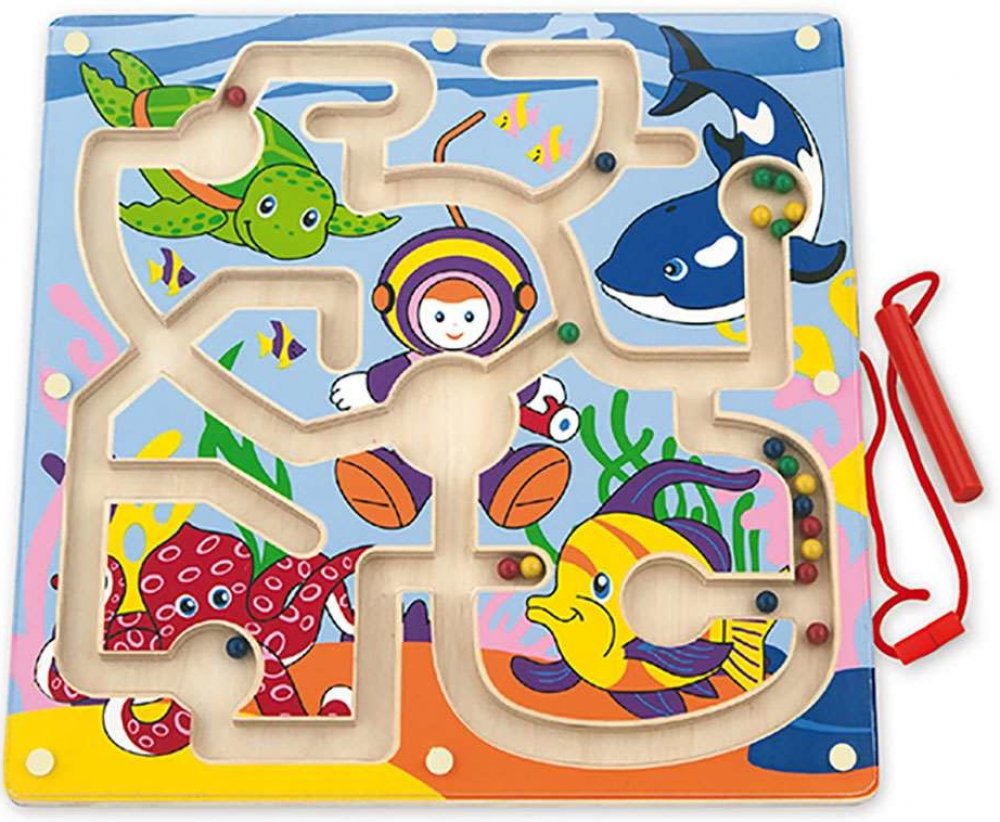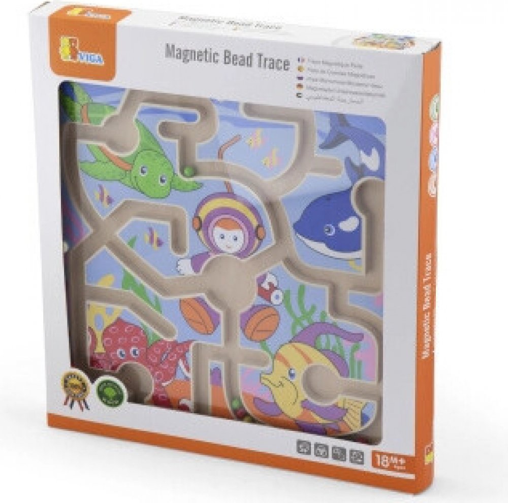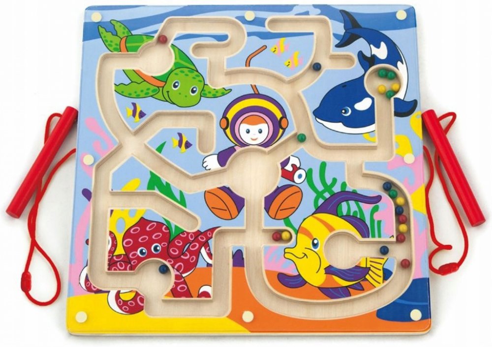 Magnetický podmořský svět od společnosti Viga je ideálním dárkem, který potěší každé dítě. Na dřevěné desce je kresba znázorňující podmořský svět, je na ní také bludiště s kuličkami. Batole pomocí magnetického "tužky" navede příslušný počet kuliček k různým podmořským živočichům. Nasměrováním kuliček, které má v držení veselý potápěč, se dítě vydává vstříc : delfínem, želvou, chobotnicí a rybou, cestou míjí různé přírodniny, např. chaluhy, korály, a poznává tak svět v hlubinách oceánu. Celé je to chráněno průhledným okénkem z plexiskla.