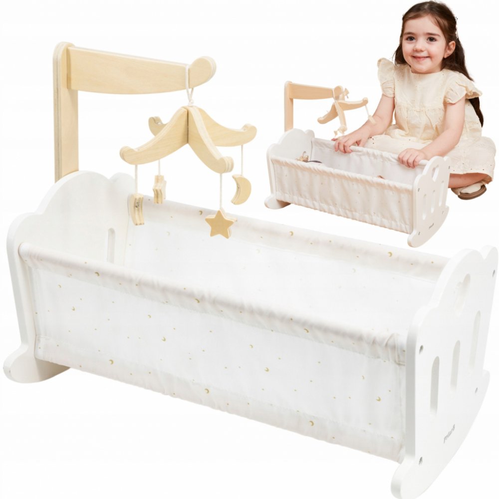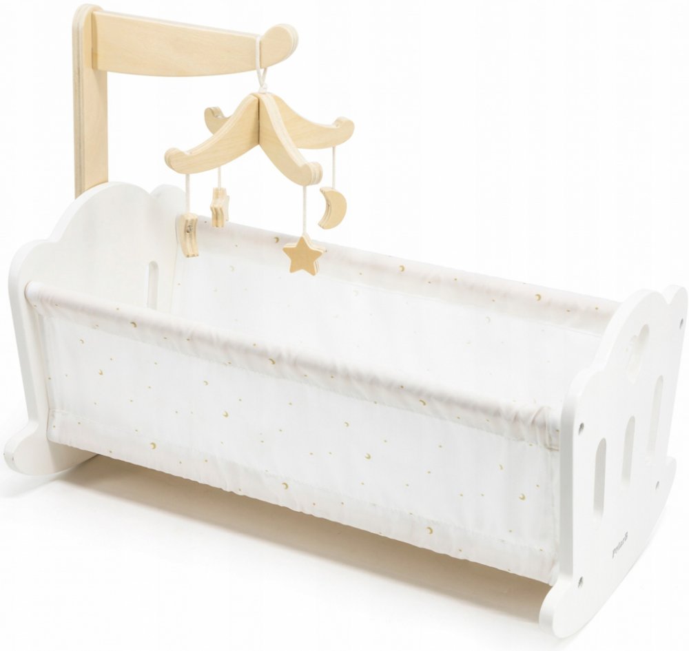 Viga PolarB - dřevěná postýlka kolébka pro panenku miminko do velikosti 38cm. Součástí bavlněný polštářek a přikrývka + kolotoč nad postýlku.