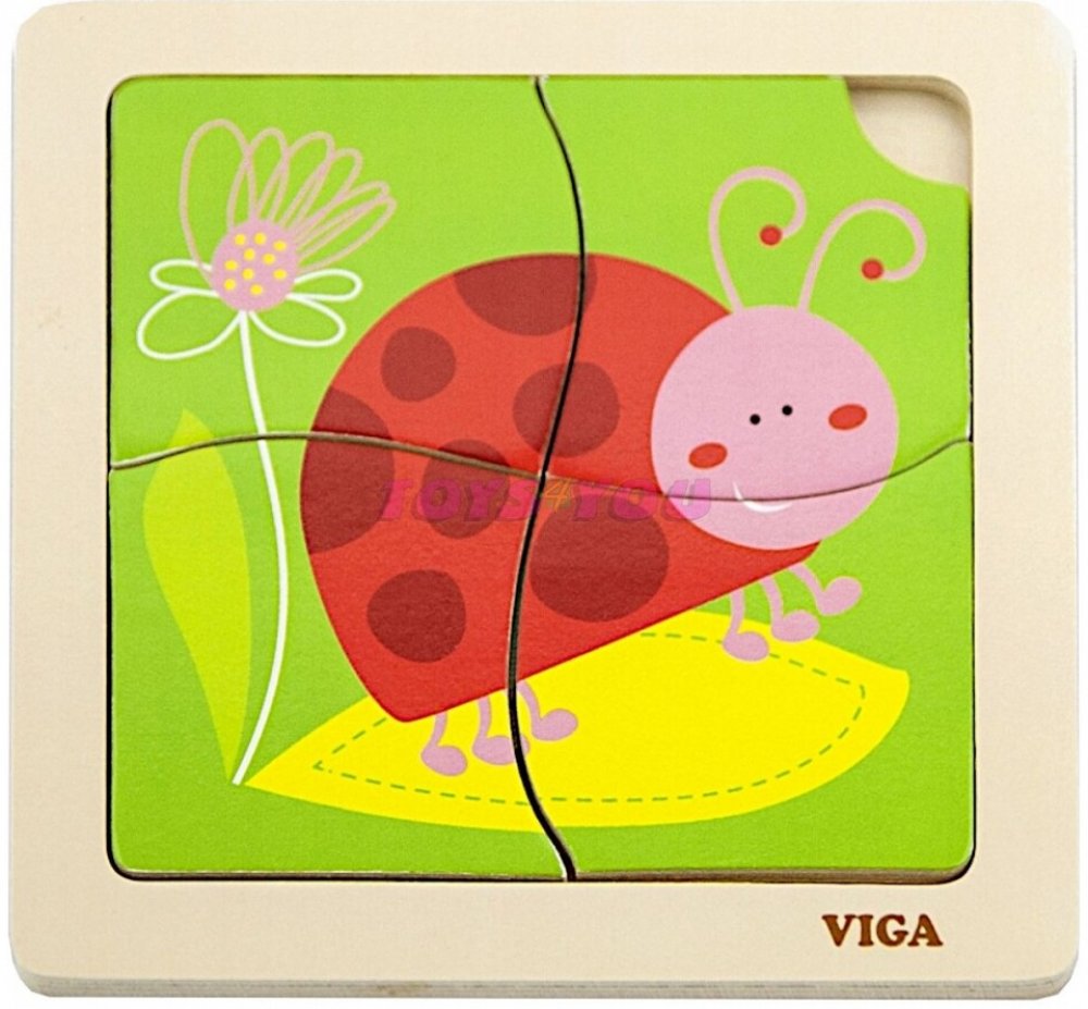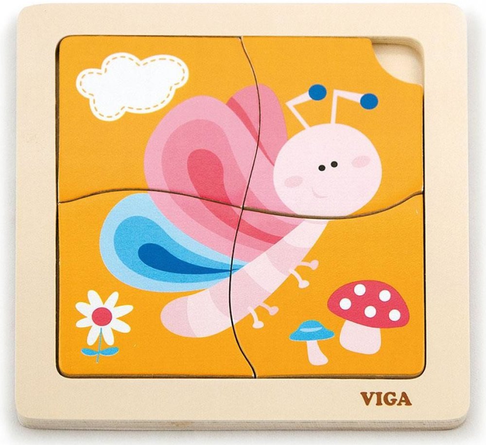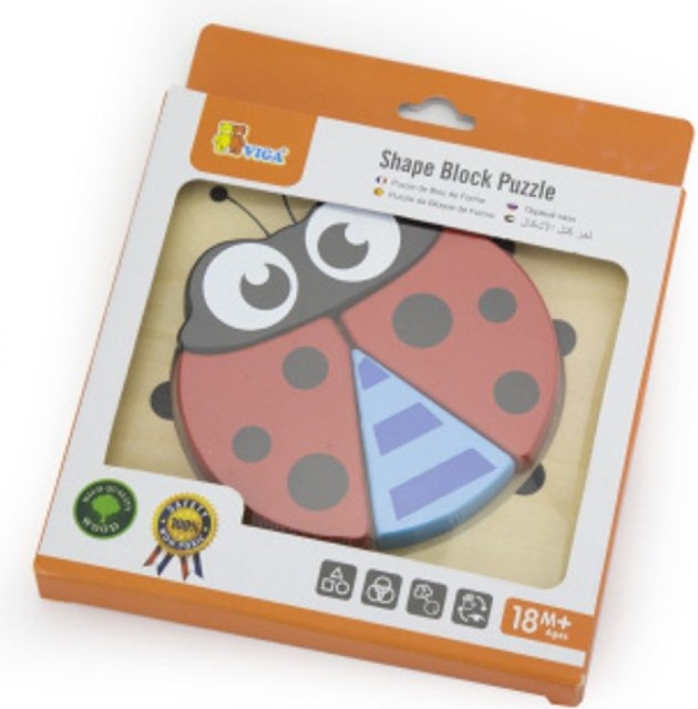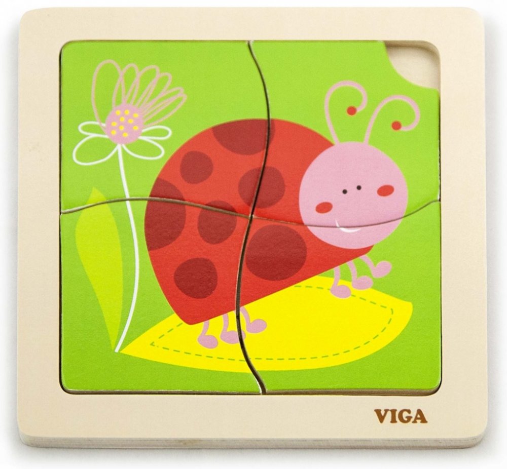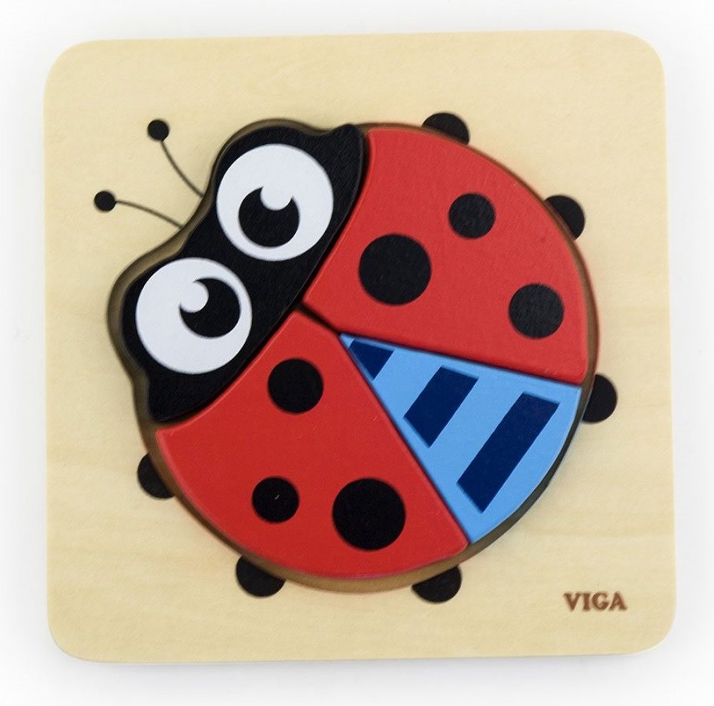 Barevné a velmi jednoduché puzzle pro batolata od společnosti Viga ve tvaru berušky. Sada obsahuje čtyři dílky, které je třeba poskládat na dřevěnou podložku. Když vaše dítě správně poskládá tvary, vznikne puzzle s novým kamarádem. Obrázek je v živých barvách, které upoutají pozornost vašeho dítěte.