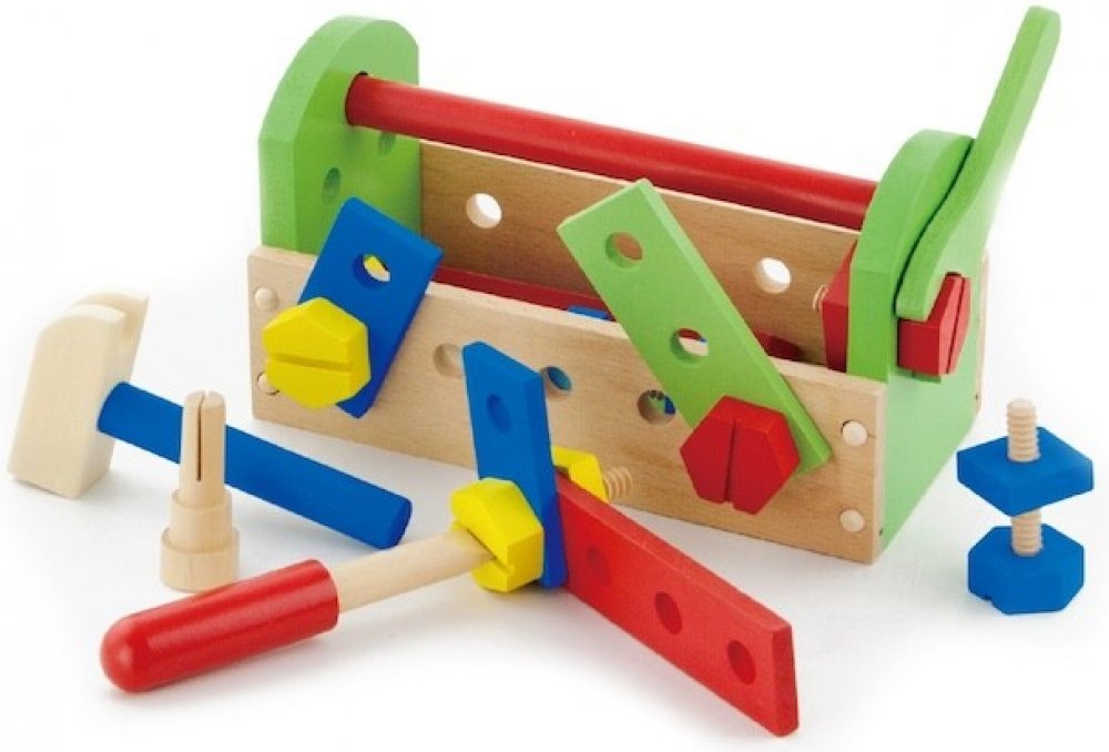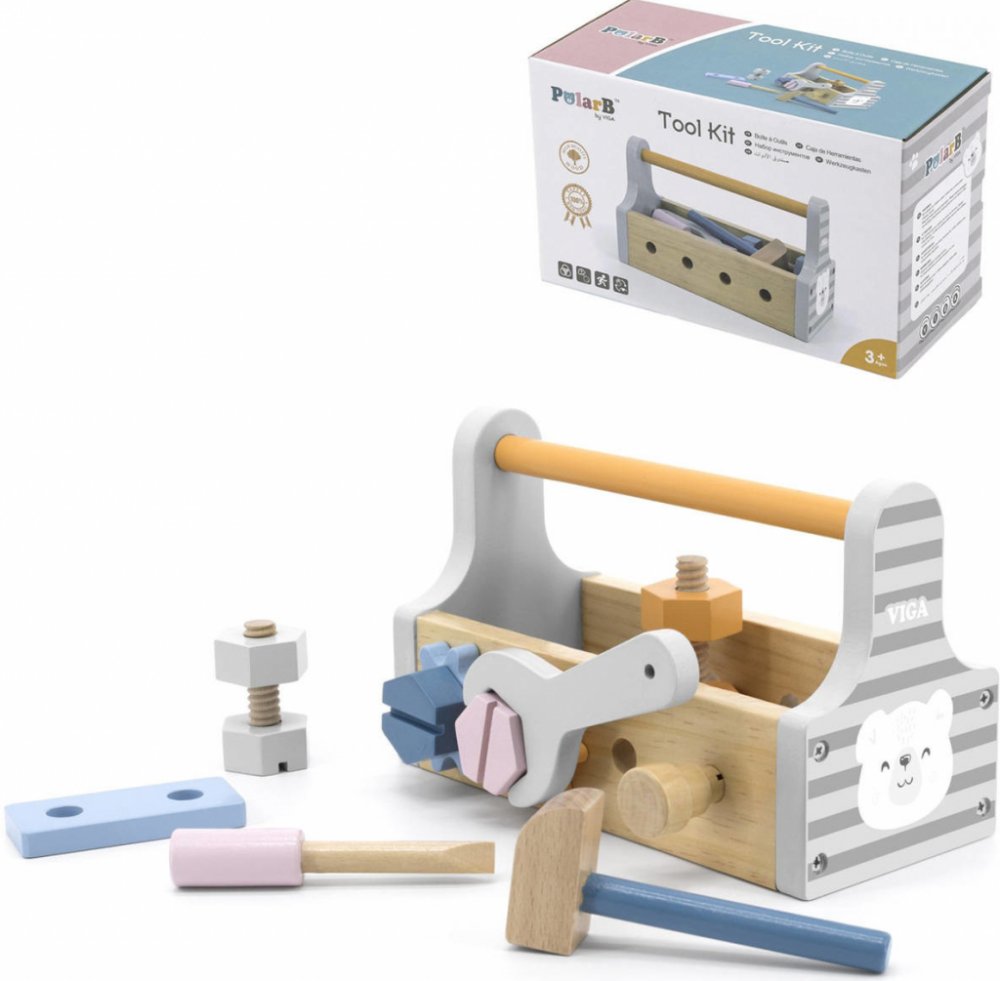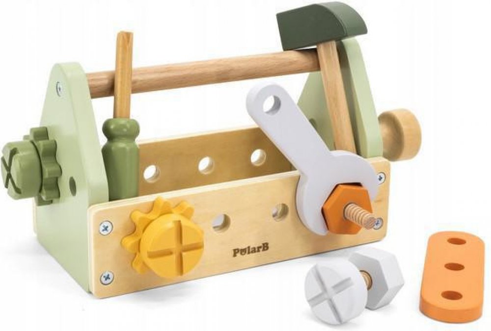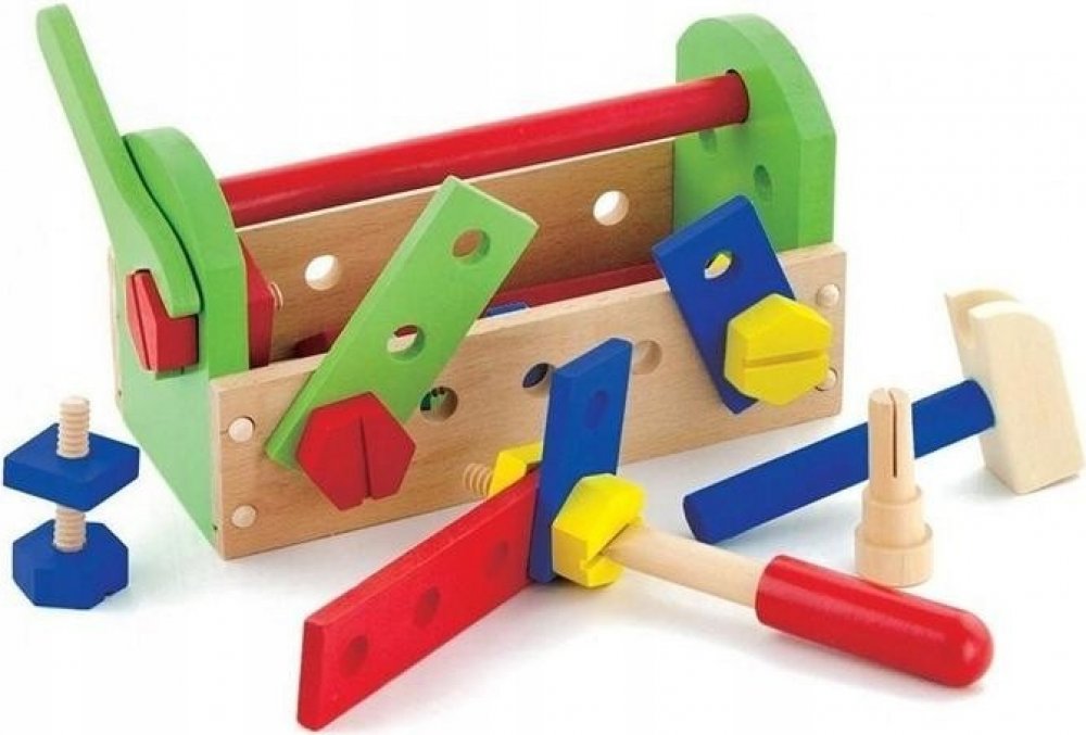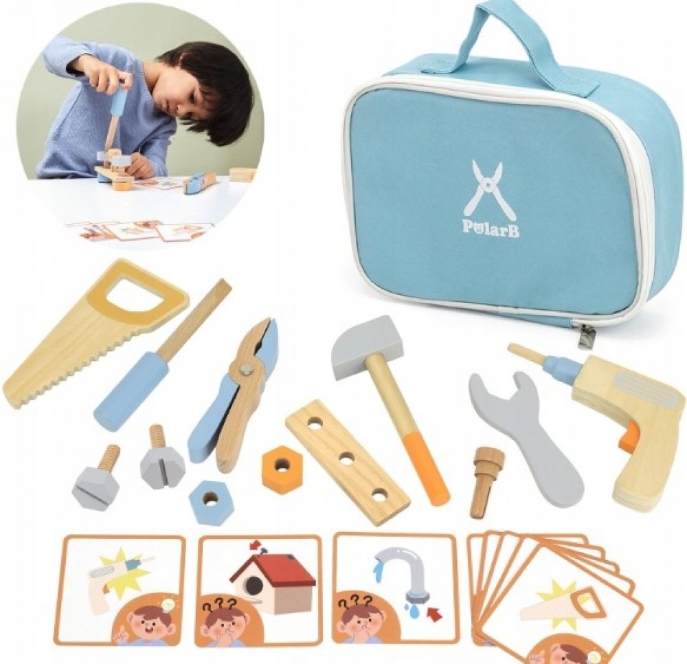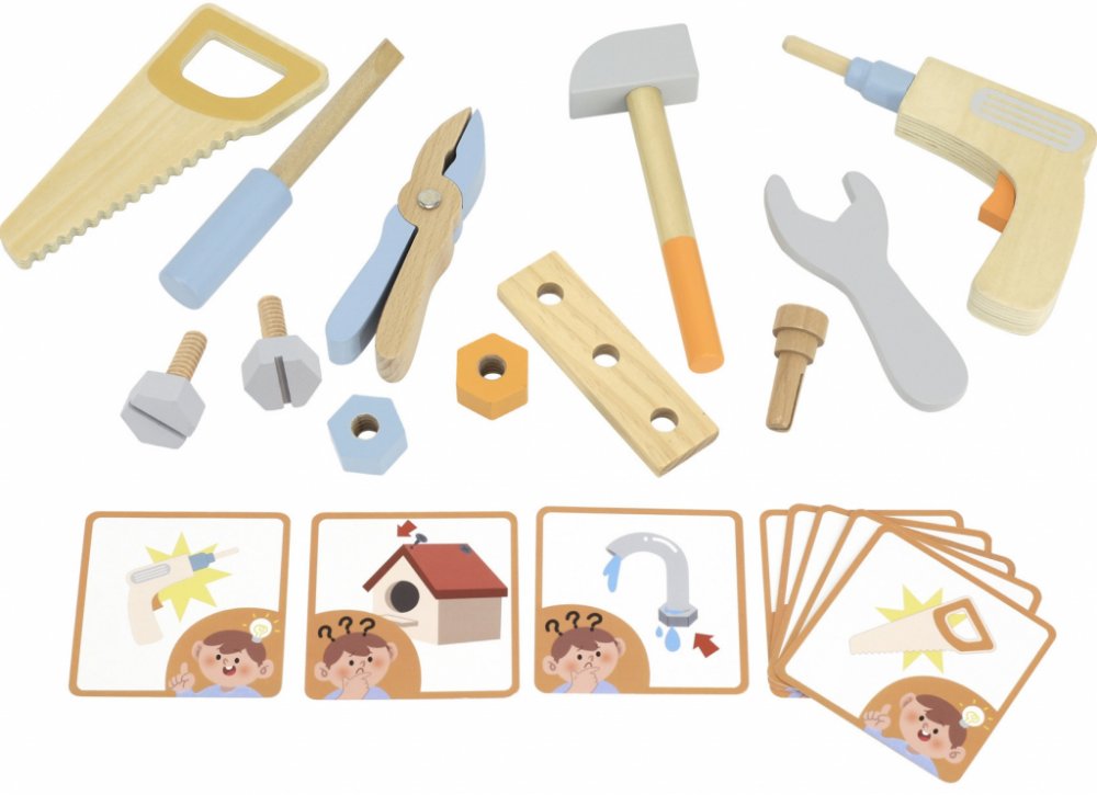 Sada obsahuje: - Pila - Šroubovák - Klíč - Vrtačka - 2 matice - Kladivo - Kleště - Dřevěná deska s otvory - Šroub - Kartičky s návrhy, jak používat nástroje a řešit problém - Estetický úložný kufřík
