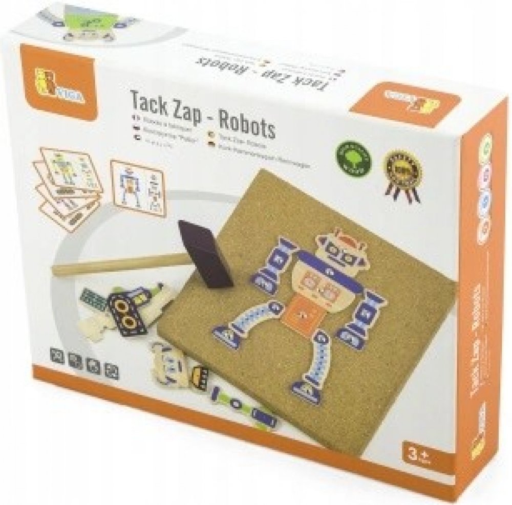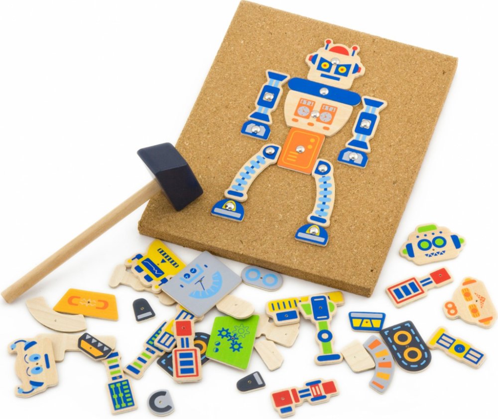 Taková sada pomáhá formovat přesnost pohybů rukou a zlepšuje koordinaci očí a rukou. Tyto výhody nelze nahradit žádnou jinou hračkou. Sada obsahuje 45 dřevěných prvků k přibíjení, korkovou desku, dřevěné kladívko a 5 karet s 10 příklady robotů, které lze z kostek postavit. Hračka byla vyrobena z nejkvalitnějšího dřeva.