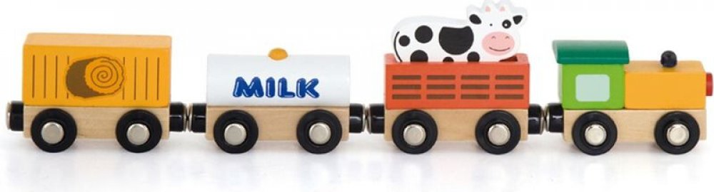 Pěkný farmářský vláček. Vlak má mašinku a tři vagónky a kravičku. Vagónky a mašinka se připojují pomocí magnetů. Rozměr mašinky a vláčků cca 7x4,5x2,5cm, napojení k sobě magnety. Rozměry balení cca 34x8x3,5cm.
