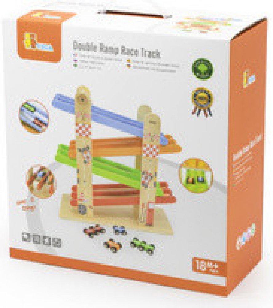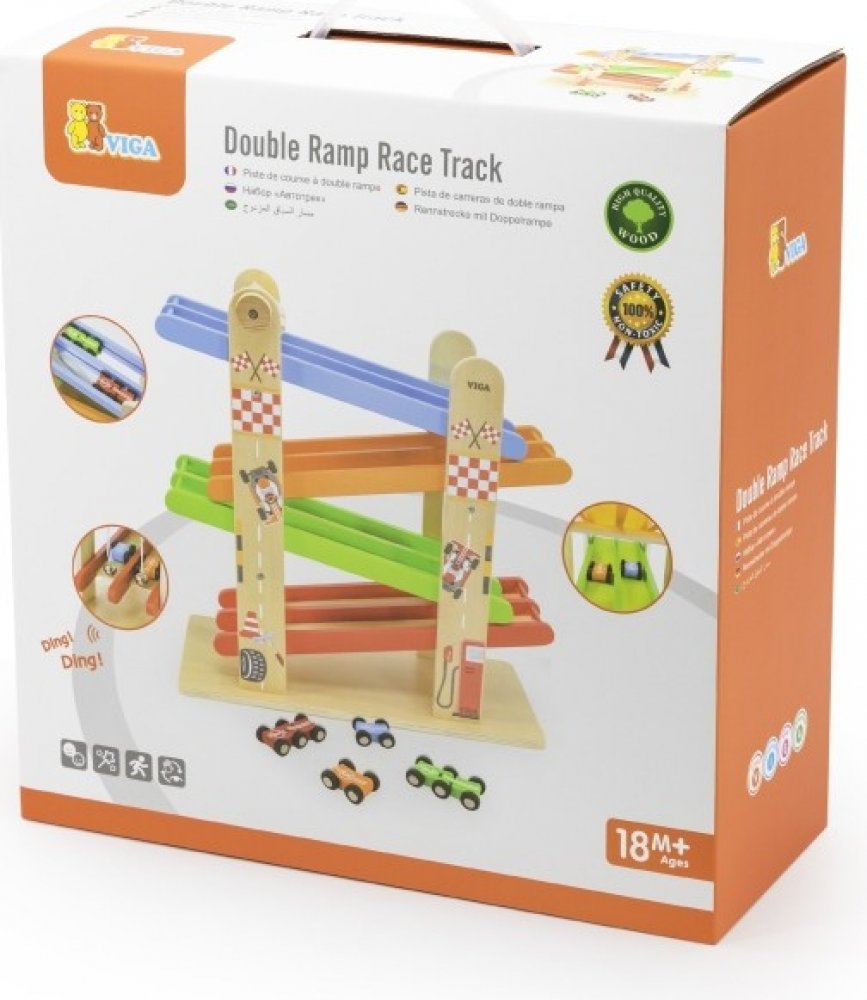 Zábavná dřevěná závodní dráha s dvojitým pruhem od Viga přináší dětem nekonečné závody a radost z pohybu. Dva paralelní pruhy umožní pořádat souboje dvou autíček najednou, na konci je přivítají zvonky v cíli. Odolné provedení z lakovaného dřeva, bez ostrých hran a s netoxickými barvami je bezpečné pro malé ruce. Součástí je 4 barevná autíčka ve dvou provedeních (4kolová a 6kolová), která podporují...