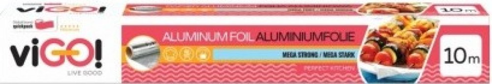 viGO alobal extra silný 15 μ, šířka 29 cm, délka 10 m Alobal role o délce 10 m. Využití alobalu je mnohostranné například na zabalení svačiny, na zabalení neuzavřeného pokrmu atd.