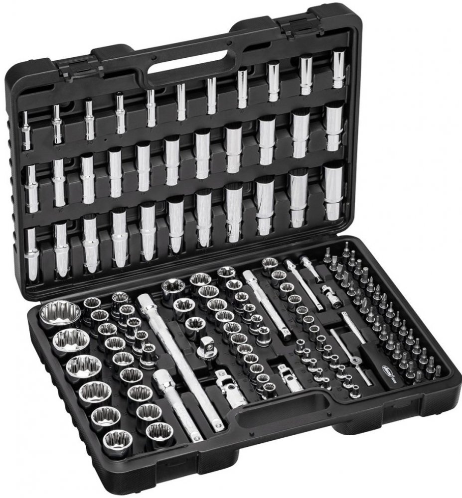 133-dílná sada nástrčných klíčů / hlavic / bitů 1/4"-3/8"-1/2" v plastovém kufříku je vyrobena z kvalitního chrom-vanadia.
