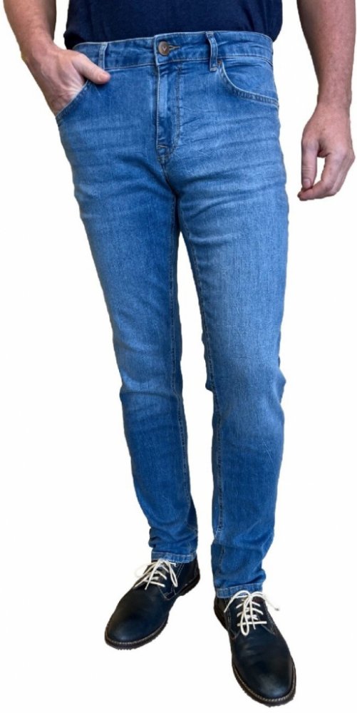 Moderní pánské pěti kapsové džíny Vigoss úzkého střihu se středně vysokým sedem a mírně se zužujícími nohavicemi. Rifle jsou vyrobeny z příjemného středně modrého denimu, lehce ošoupané a mají díky praní lehký "žilkovaný" efekt. Příměs elastanu zaručuje pohodlí při nošení. Džínsy jsou prošity dvojitým žlutým stehem včetně originálního ozdobného prošití zadních kapes a mají mosazné nýty a knoflík s...