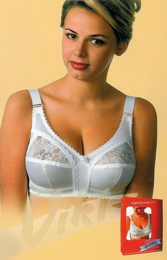 Mimořádně oblíbená podprsenka bez kostic pro ženy s větším poprsím 579 Viki v béžové barvě. Díky vysokému středu je podprsenka oblíbená a pohodlná při běžném nošení. Košíčky jsou krajkové vnitřní část je podšitá bavlnou. Mezi košíčky jemná mašlička. Široká ramínka, která se dají nastavit pro lepší pohodlí. Zapínání na tři háčky se dvěma stupni stažení.