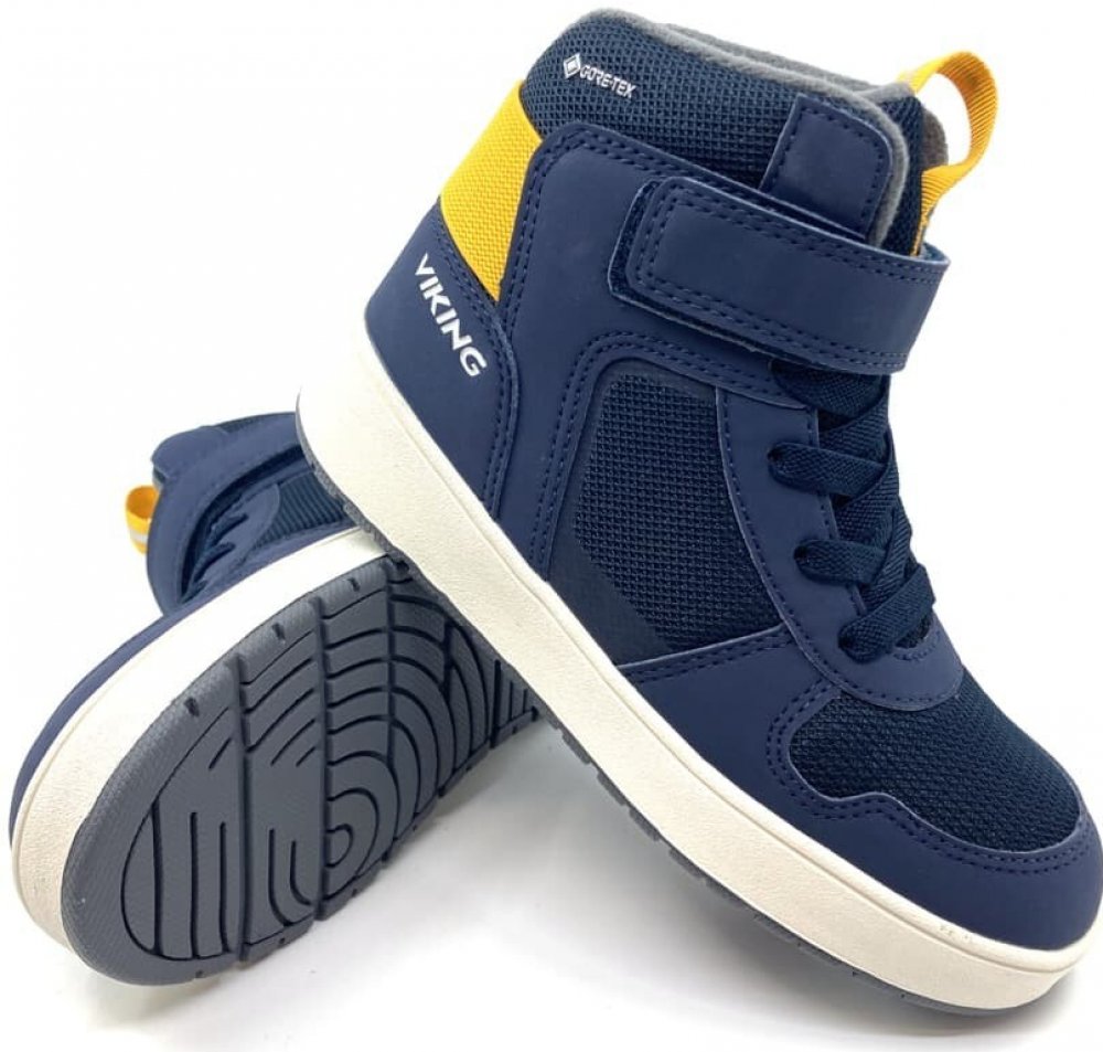 Moderní chlapecké zimní boty Viking Jack Warm GTX - Navy v modré barvě se žlutými detaily a klasickou bílou podrážkou. Boty jsou výrazně zateplené kožíškem.