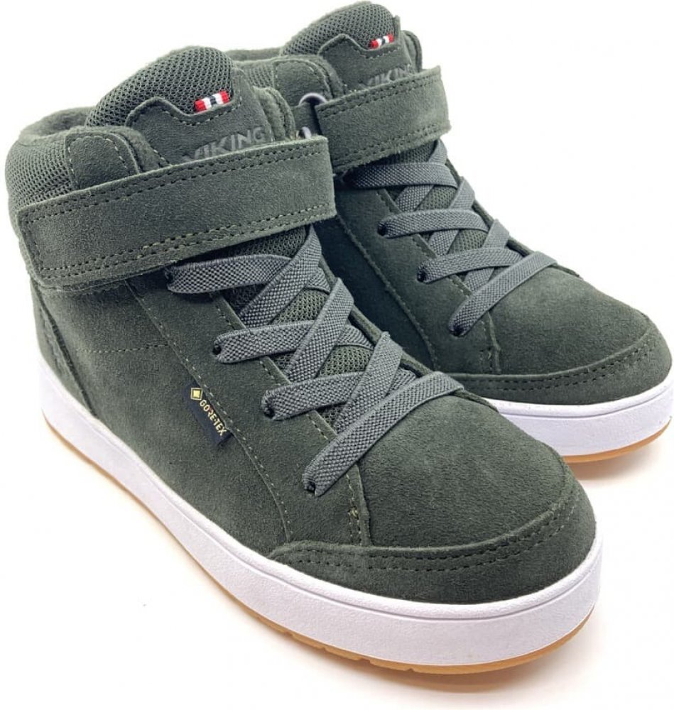 Moderní chlapecké zimní boty Viking Eagle Warm GTX - Hunt green v zelené barvě s klasickou bílou podrážkou, která je ze spodní strany v barvě přírodní gumy. Vkusná kombinace kůže a textilních materiálů. Boty jsou výrazně zateplené kožíškemy