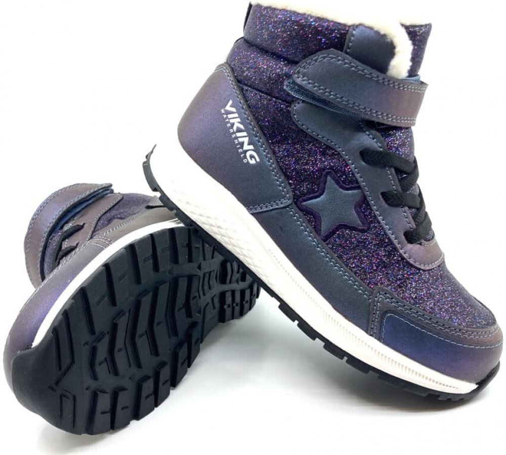 Viking Equip Star Warm WP 1V SL jsou dívčí zimní boty v černé barvě s fialovými třpytkami, které kombinují styl a pohodlí. Nepromokavá membrána udrží nožky v suchu, zatímco teplounký kožíšek zajistí teplo i v mrazech. Boty od norského výrobce Viking jsou poměrně lehké, mají protiskluzovou odolnou podrážku, která dobře absorbuje vibrace.