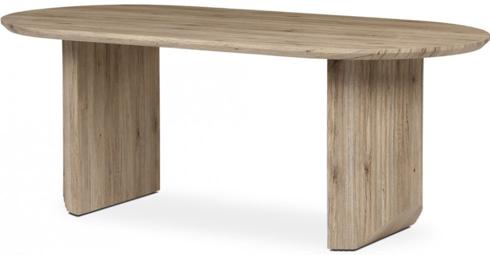 Jídelní stůl značky v přírodní dubové barvě vyniká moderním designem a kvalitním zpracováním. Oválná deska z MDF materiálu je odolná a snadno udržovatelná, což z něj činí ideální volbu pro rodinné večeře i slavnostní příležitosti. Matná povrchová úprava a detailně propracované nohy dodávají stolu stylový vzhled.