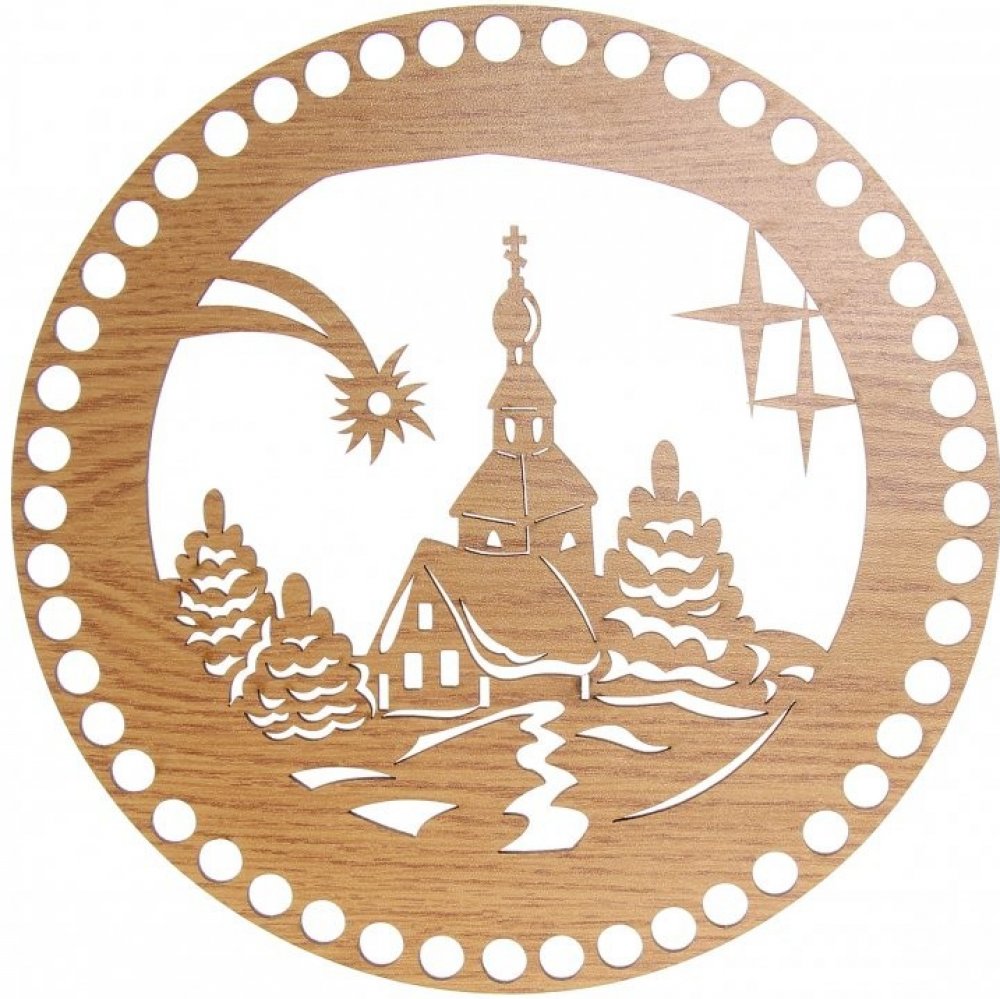 Víko na košík kruh Ø 20 cm, zdobené vyřezaným obrázkem kostela s kometou.