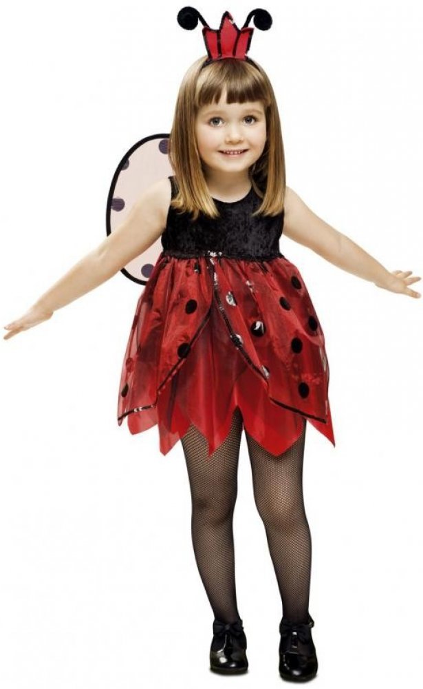 Černočervené šaty bez rukávů mají vrchní díl černý. Spodní díl tvoří vrstvená sukně z červené a průhledné černé cípaté látky. Přes sukýnku jsou přišity dva oválné díly z průhledné lesklé červené látky poseté černými puntíky a lemované černými flitry tvořící dojem krovek. Ke kostýmu patří také průhledná černě lemovaná křidýlka s černými puntíky a černá čelenka s červenou korunkou zdobenou černými flitry a černými tykadly. Křídla jsou přichycena suchým zipem.