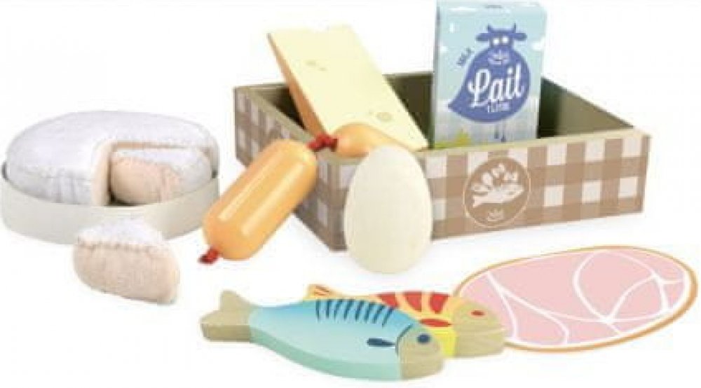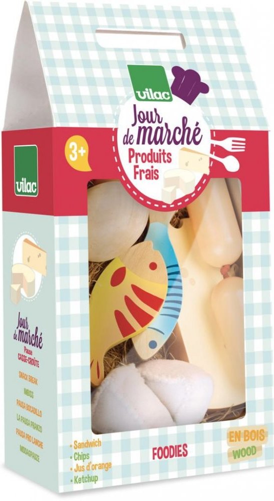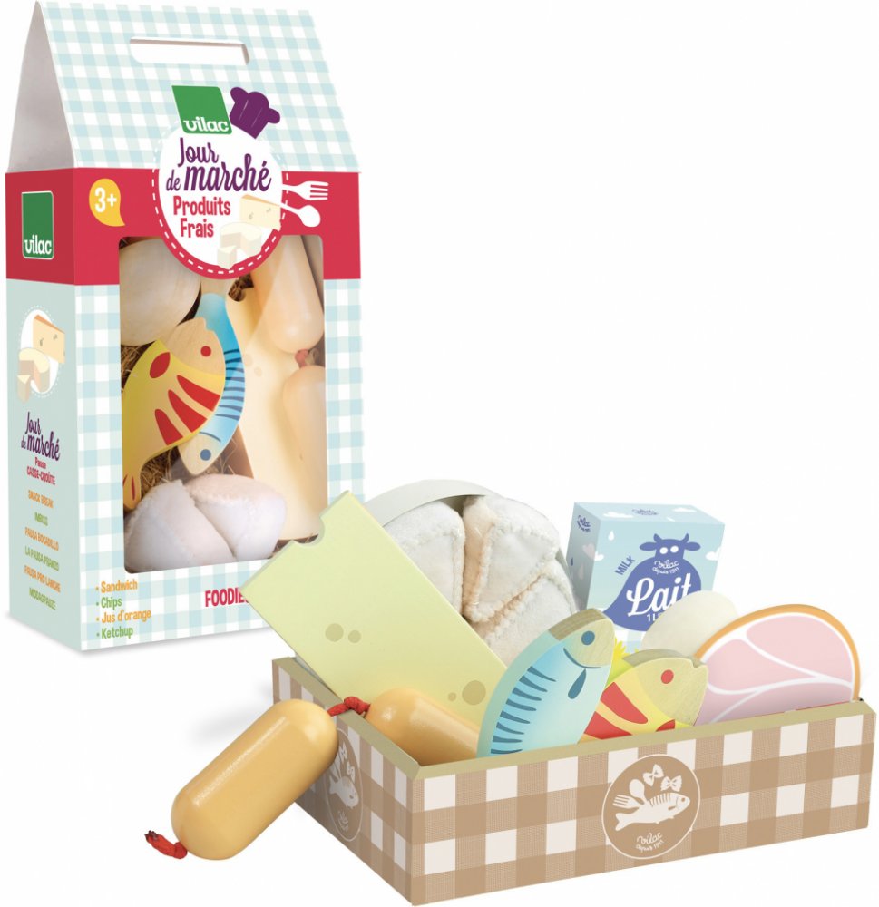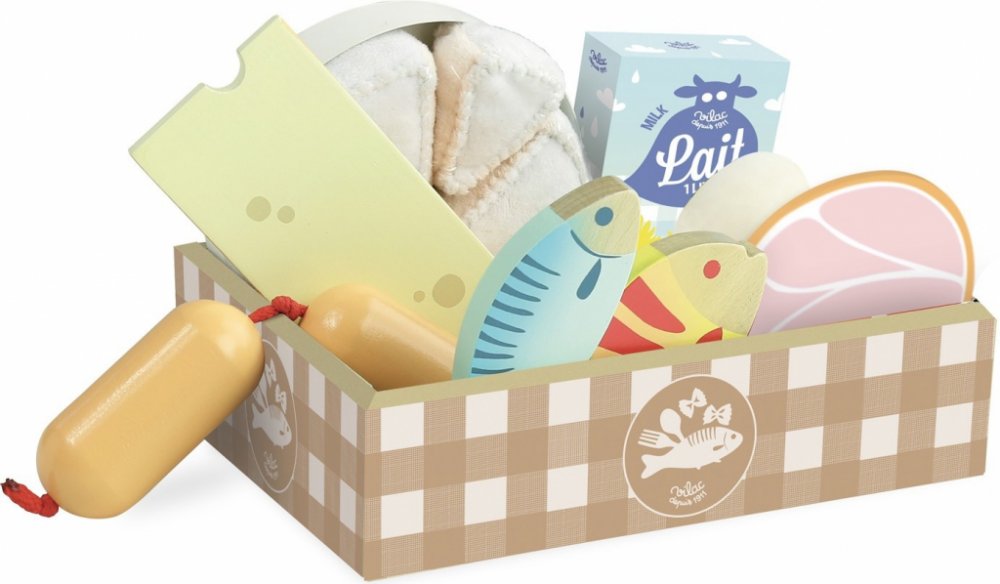 Pěkný lepenkový box obsahuje 2 ryby, plátek šunky, vejce, krabici mléka, sýr a špekáčky. Tento set je idálním doplňkem do kuchyněk Vašich dětí, 11 dílná sada. Hračky Vilac mají značku francouzské agentury ADEME, to znamená, že tyto dřevěné hračky jsou vyráběny ekologicky. Šetří životní prostředí, neznečišťují půdu, vodu a vzduch, neplýtvají energiemi.