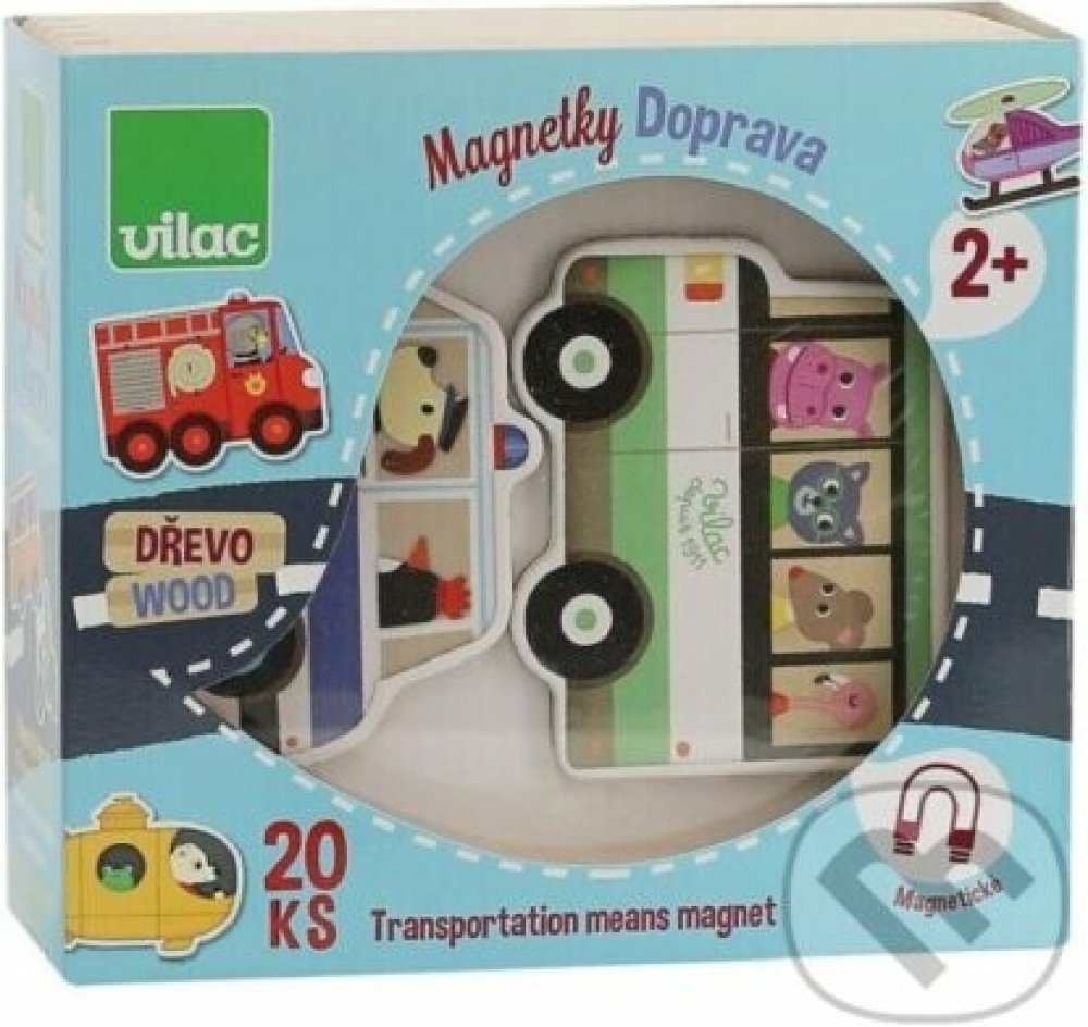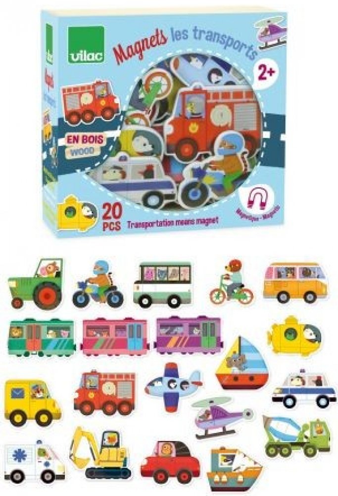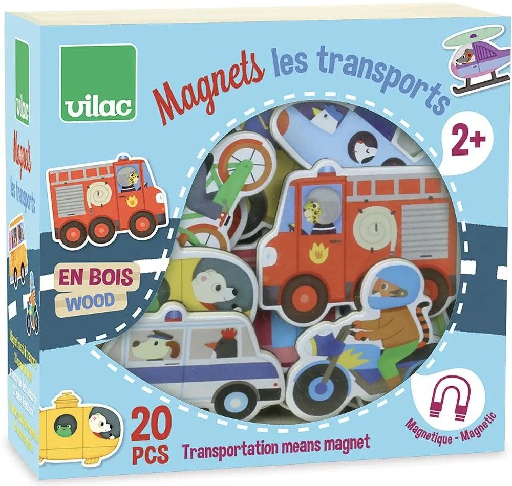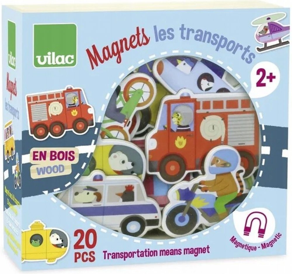 Vilac Dřevěné magnetky doprava 20 ks Sada dvaceti dřevěných magnetů s motivy dopravních prostředků.