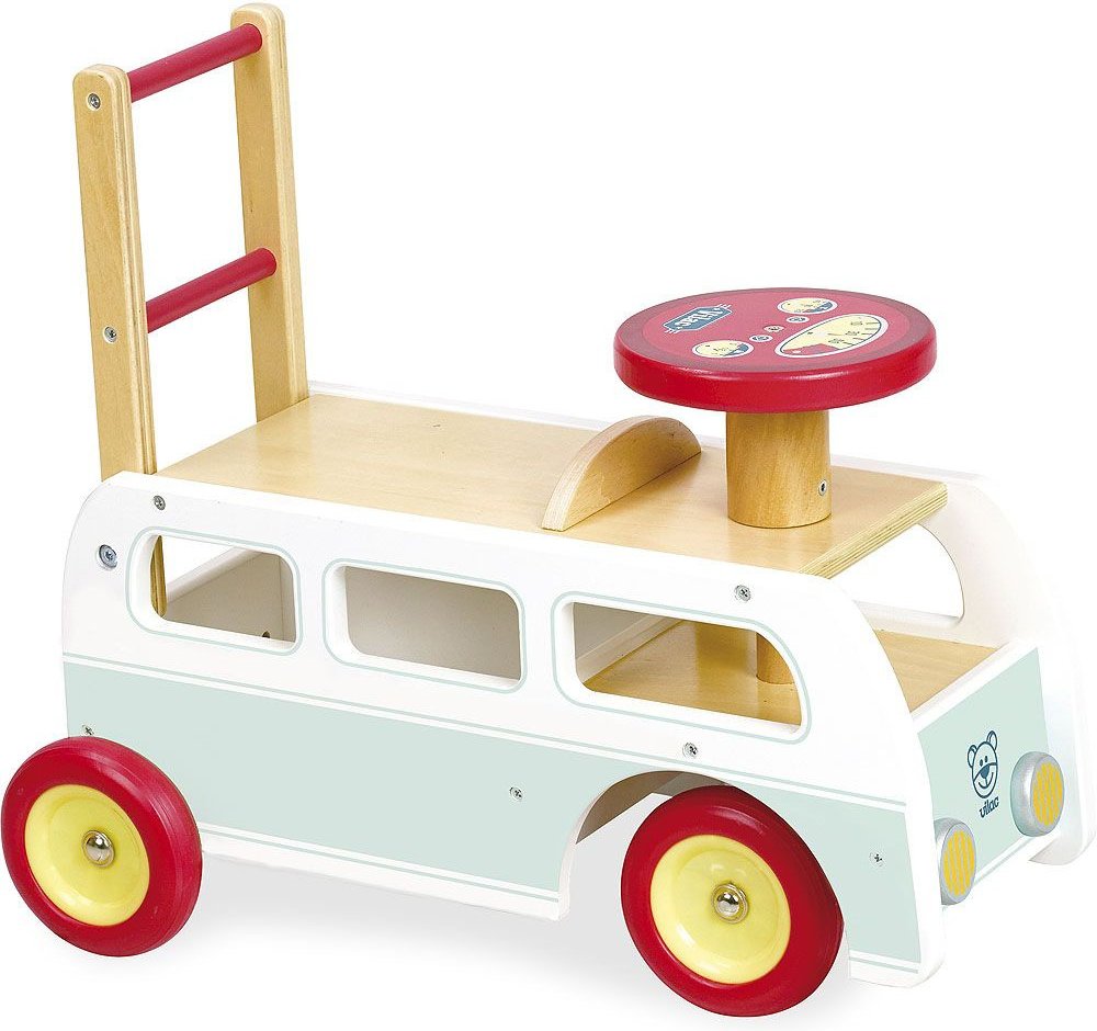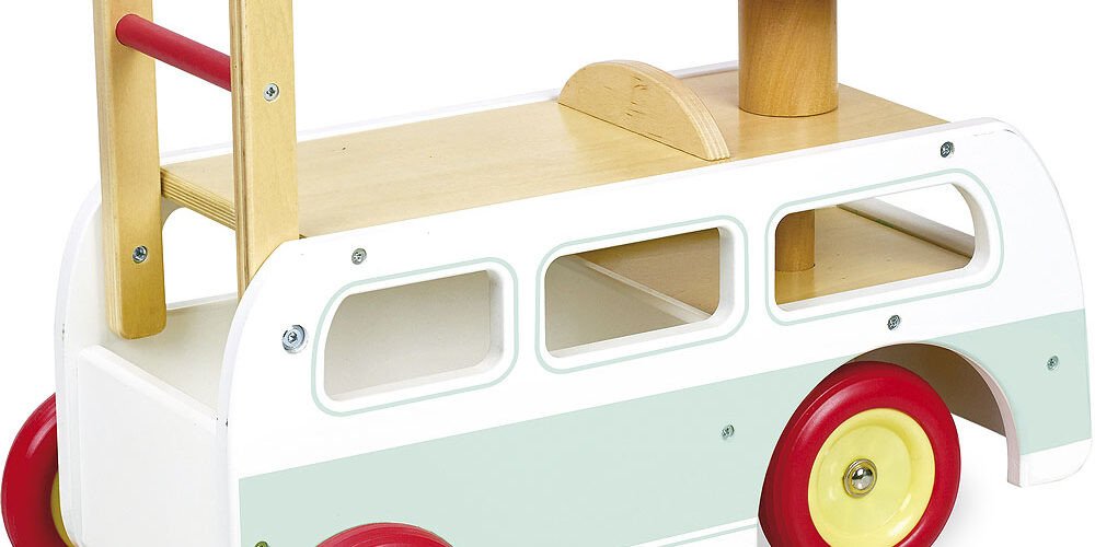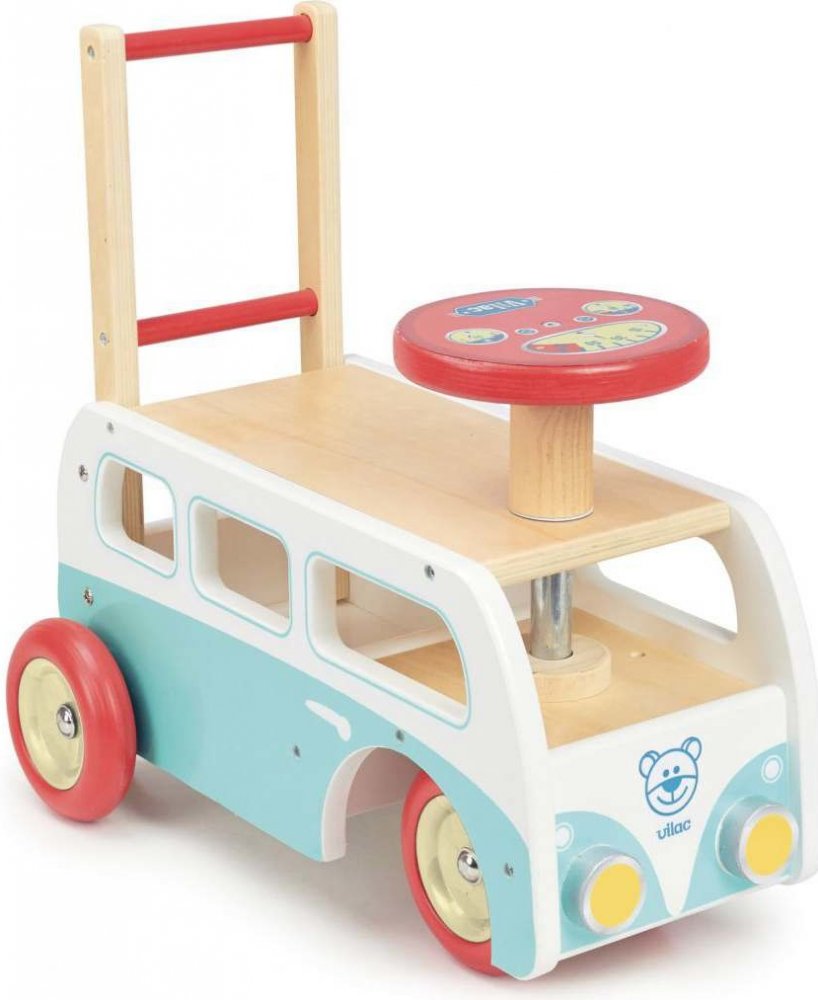 Dřevěné odrážedlo a vozíček v jednom je vybaven systémem, který zabraňuje překlopení. Je velmi stabilní. Volantem se otáčí kolečka ve směru jízdy. Praktický úložný prostor na hračky.