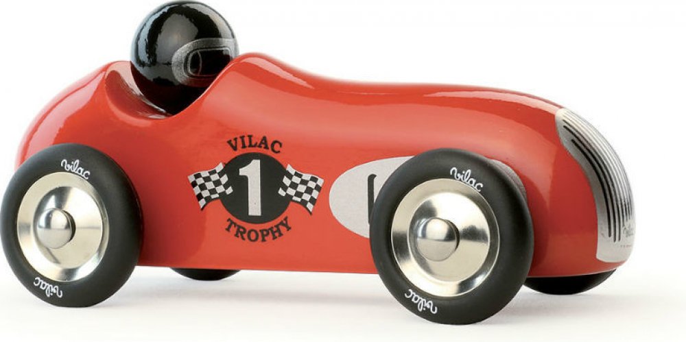 Vilac Historické závodní auto červené. Vilac Historické závodní auto červené Červené vintage závodní auto vyrobeno z lakovaného dřeva s kovovými pogumovanými koly. Je vhodné jak ke hraní tak jako dekorace do pokojů dětí či dospělých. Vyrobeno ve Francii. Hračky Vilac mají značku francouzské agentury ADEME, to znamená, že tyto dřevěné hračky jsou vyráběny ekologicky. Šetří životní prostředí, nezne...