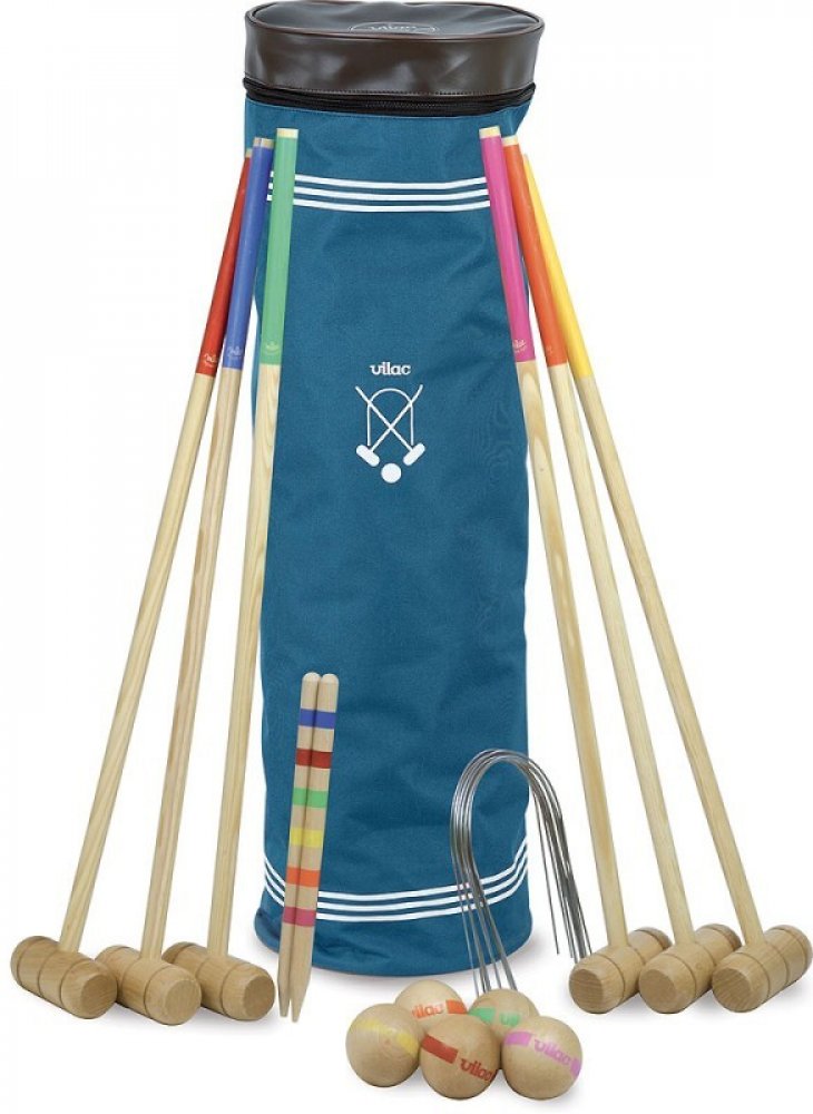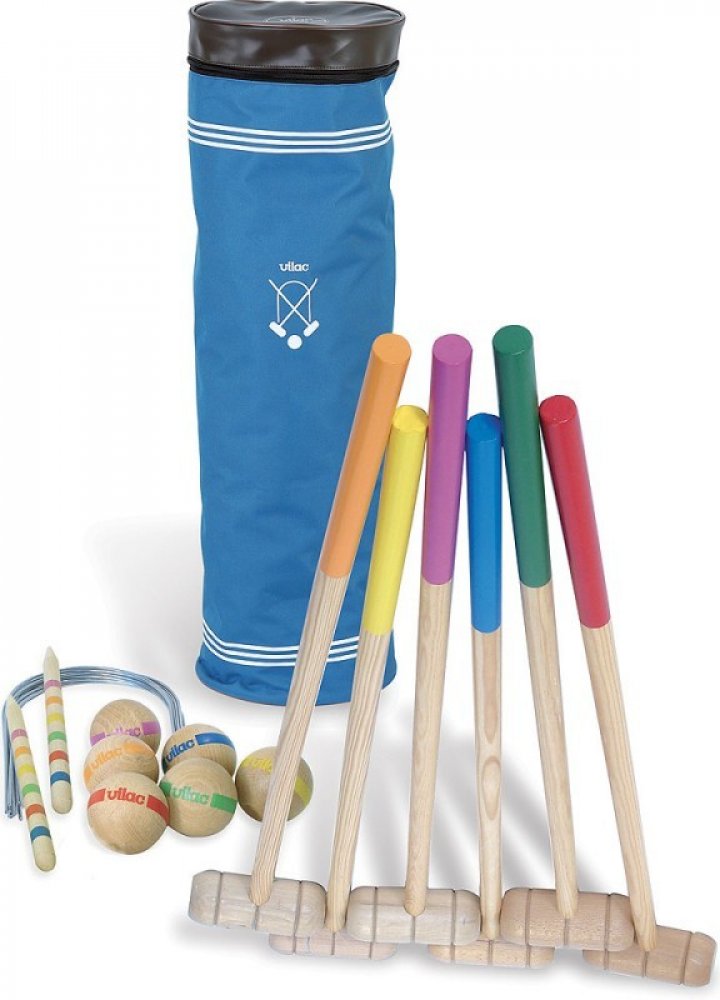 Velký kroket pro 6 hráčů. Obsahuje šest palic, deset branek, šest koulí a dva kolíky. Dřevěné doplňky jsou barevně rozlišené. Vše zabaleno ve velké tašce na zip.