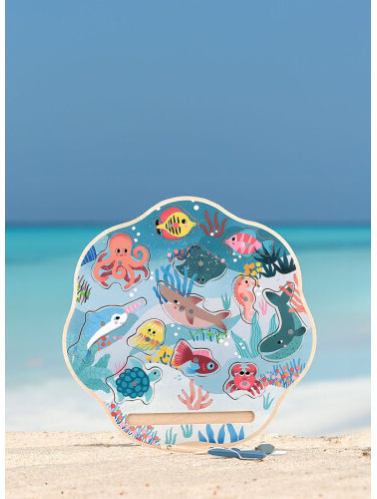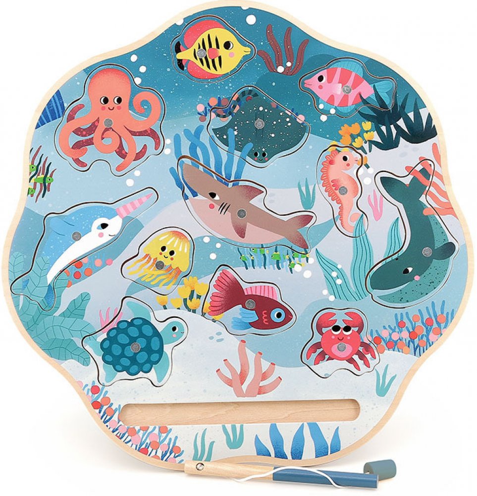 Magnetická hra, která Vás opravdu nadchne! Rybařte s mořskými živočichy v krásném designu od ilustrátorky Michelle Carlsund. Podaří se Vám z moře vytáhnout rejnoka, velrybu, kraba, želvu či medúzu? K dispozici je celkem 12 barevných mořských zvířatek. Chyťte je všechny! Každý živočich má na zadní straně číslo, které označuje body. Až se Vám podaří vytáhnout všechny mořské živočichy, otočte je dnem vzhůru a spočítejte si body. Při hře tedy nezáleží na tom, kolik zvířatek se Vám podaří prutem vytáhnout, ale na tom, kdo má více bodů. Hra stimuluje kognitivní vývoj vašeho dítka. Rozvíjí koordinaci ruka-oko a jemnou motoriku. Podporuje také smyslové a vzdělávací učení. Hra obsahuje: 12 dřevěných mořských živočichů, 2 dřevěné pruty s magnetem a 1 herní základnu Hlavní vlastnosti: klasická hra v krásném designu