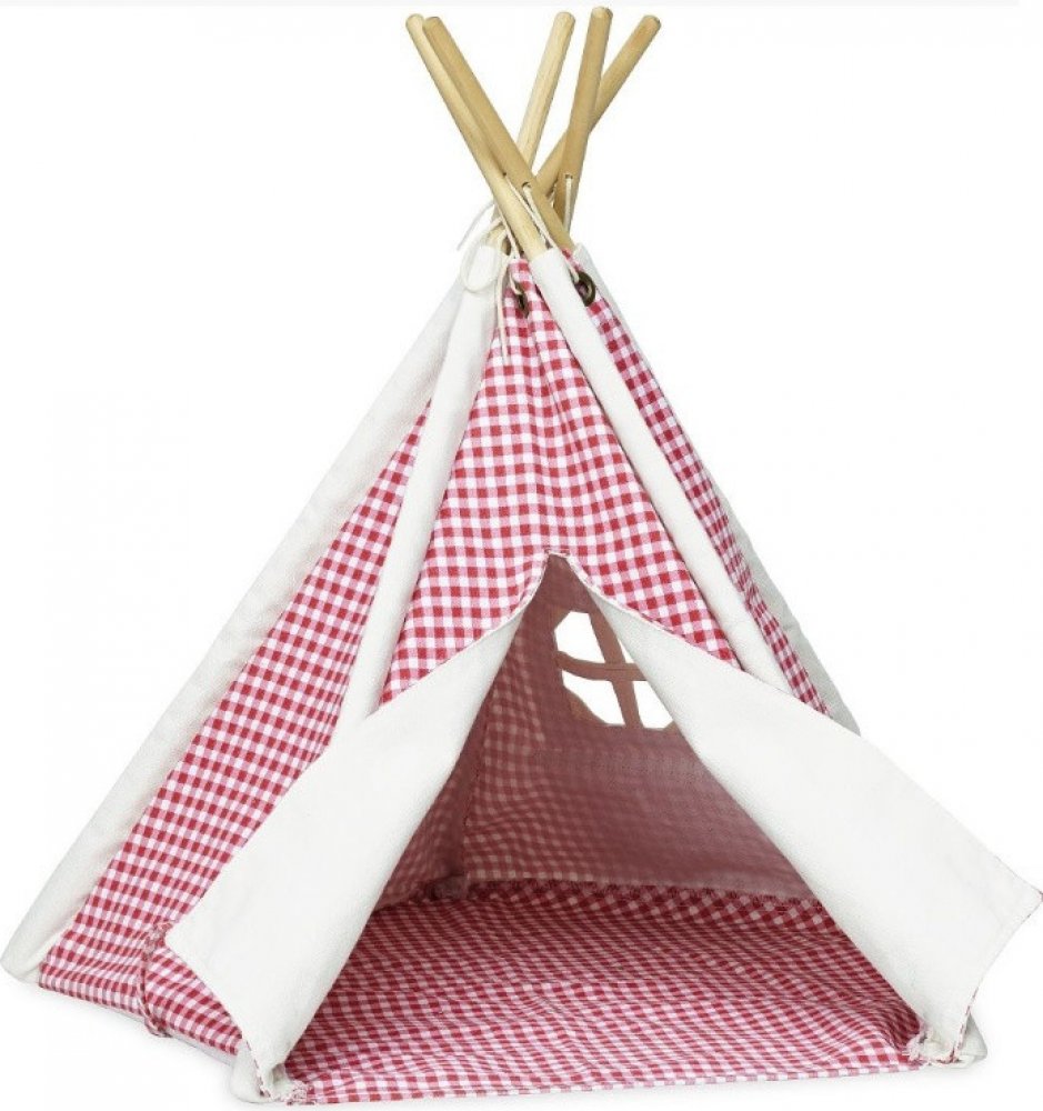 Krásné kárované týpí v mini provedení, ideální pro panenky. Dřevěný základ s textilním přehozem je jednoduché složit. Textil je červeno-bílý. Hlavní vlastnosti: týpí pro panenkypevná konstrukce
