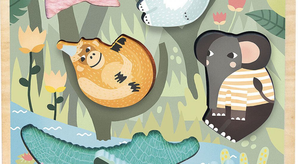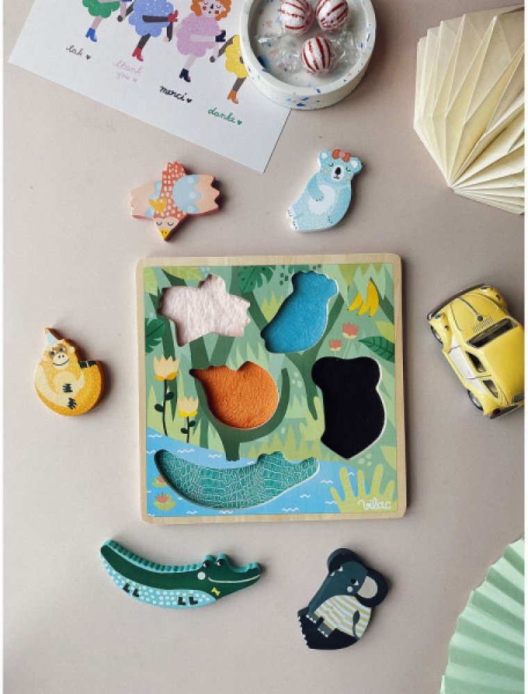 Pěkná senzorická vkládačka pro děti, plně dřevěná. Když děti z rámečku vyjmou dílek, objeví pod ním určitou látku, která má pod každým dílkem zvířete jinou texturu.